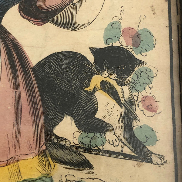 Bad kitty! I believe this very charming antique hand-colored lithograph dates to the 1840s or so, but the naughty birding cat is pretty timeless, wonderfully rendered here with yellow winged bird upside down in its mouth--and I think that is a tear in the eye of our girl as she scolds it!