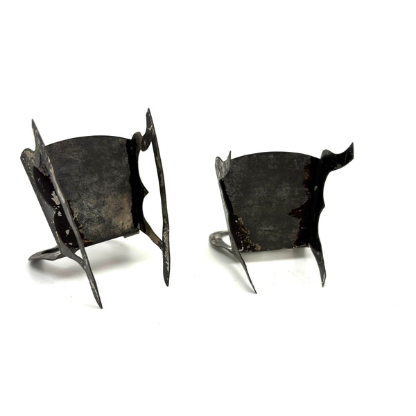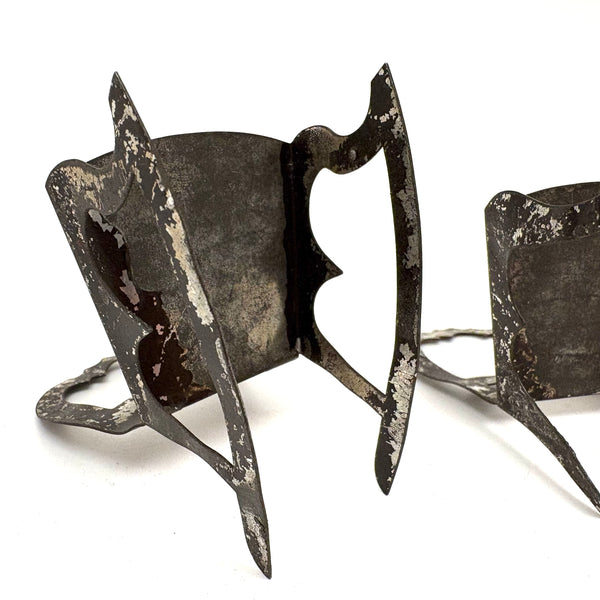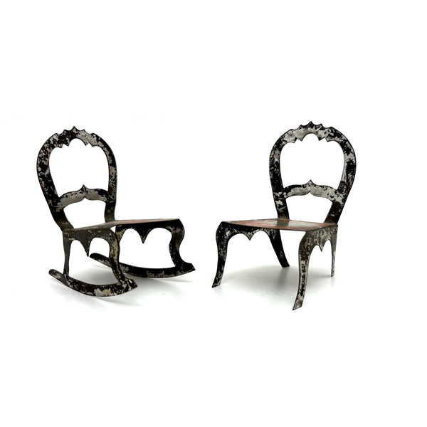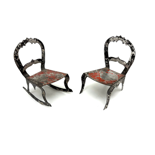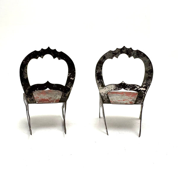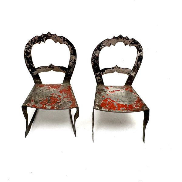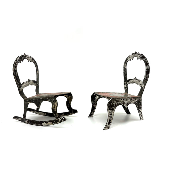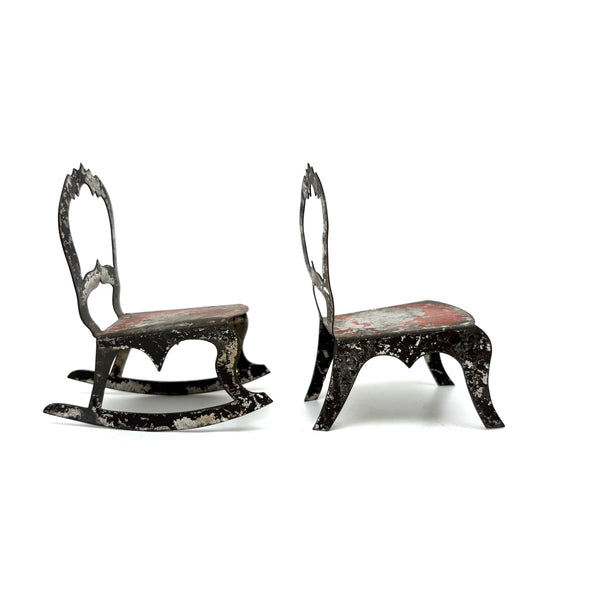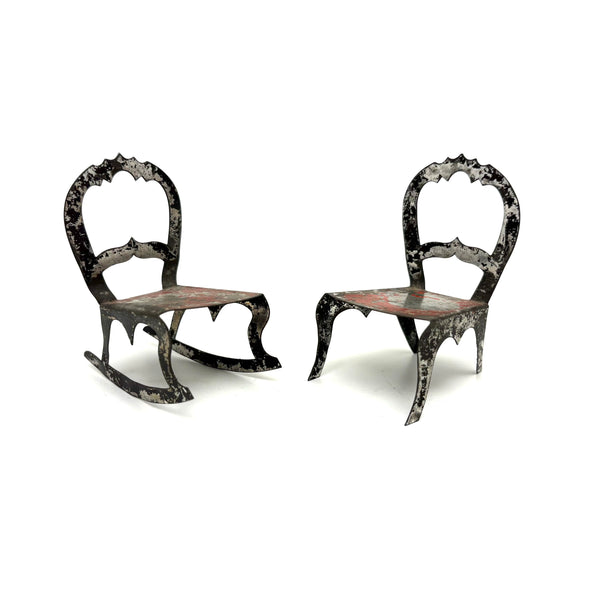 I've never seen another pair quite like these, a pair of miniature chairs, one a rocker, cut from tin and painted red and black like toleware. They feel of a piece with those antique house and church shaped tole painted still banks I like so much--in the same palette too, which makes me think likely late 19th century. And with fabulous gothic-feeling detailing to backs and sides--including some very sharp points, as if to say hands--or bottoms--off!