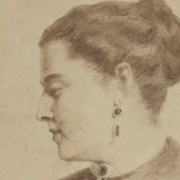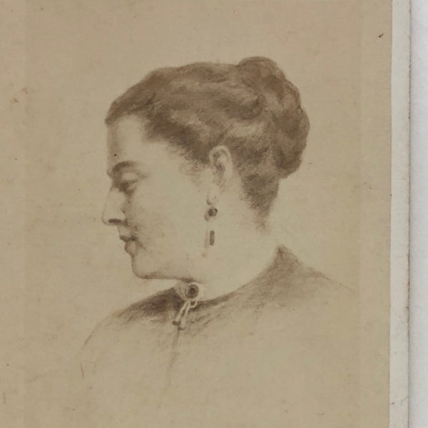 I'm always looking for daguerreotypes of drawings or paintings, but hadn't thought to look for CDV's of the same until coming across this one while digging through a box of old photos and ephemera in Maine this week. It looks to me that the portrait photographed was done in charcoal, with particular attention paid to the subject's earrings and brooch. Certainly it was drawn by an academically trained artist, and I would guess a known and notable one. The photograph was taken by Edward L. Allen (1830–1914) of Boston (the card is printed with his wonderful logo on reverse). Allen kept a studio on Temple Place (c. 1868–1871), which would be the date range on this I believe.