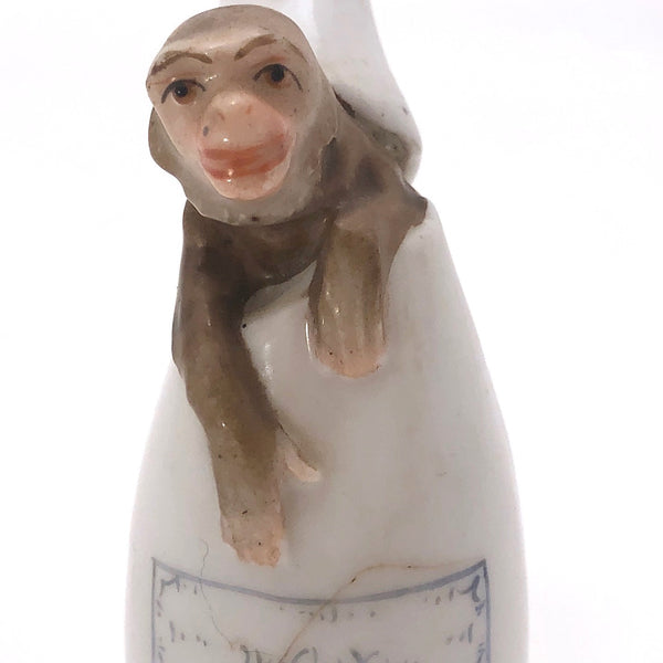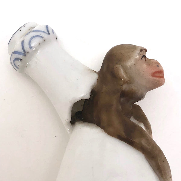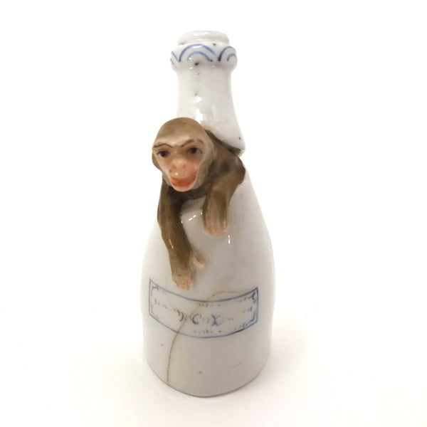 This little curiosity is one of my favorite finds ever--and a pretty rare and precious one from what I have found! Bell-shaped porcelain candle snuffers like this were made by a few different English and German producers in the 19th century, most commonly hand-painted with decorative patterns, but some in the form of figures as well. However I have found no other like this one, shaped like a bottle (champagne I think!) broken at the neck, from which the head and arms of a young monkey are emerging! So good!