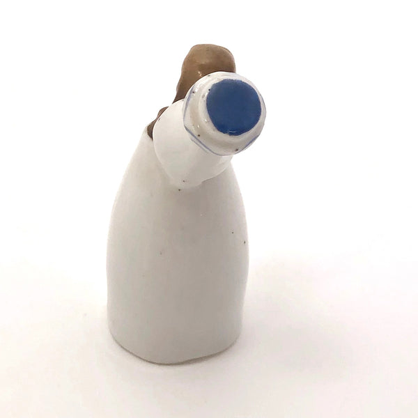 The front of the "bell" is painted in blue to resemble the label of a bottle, over which and down to the bottom runs a hairline crack, I believe incurred very long ago (see detail photos, though the best detail also shows a stray bit of fiber to the left of the crack--not a flaw!) Structurally it seems very stable and is otherwise is in very good condition, with a bit of minor staining the the the white porcelain here and there. It measures 3 1/8" tall, with an opening of 1 3/8" diameter.