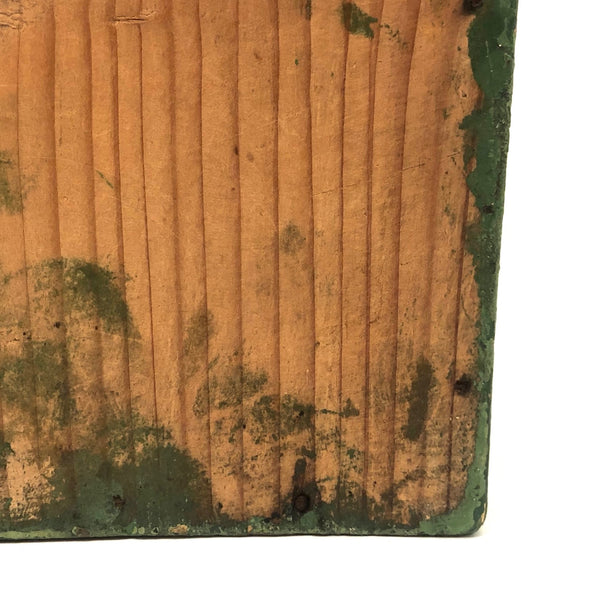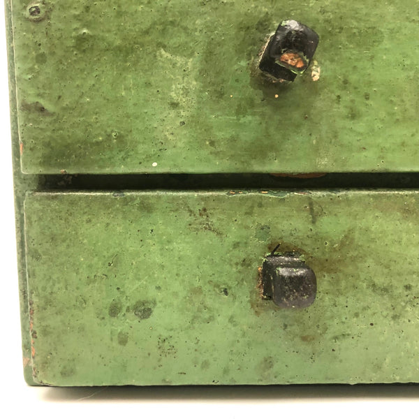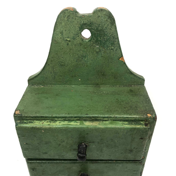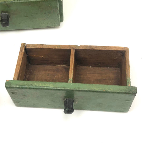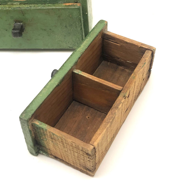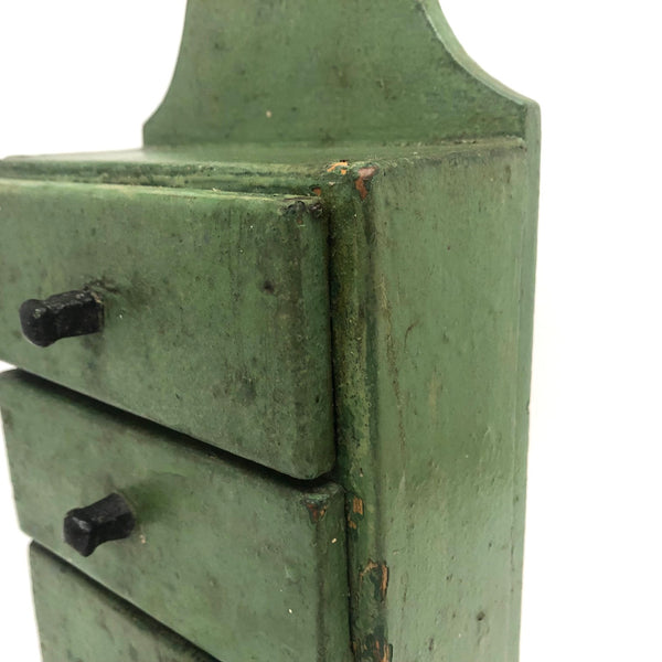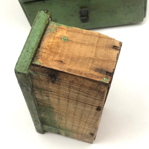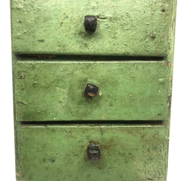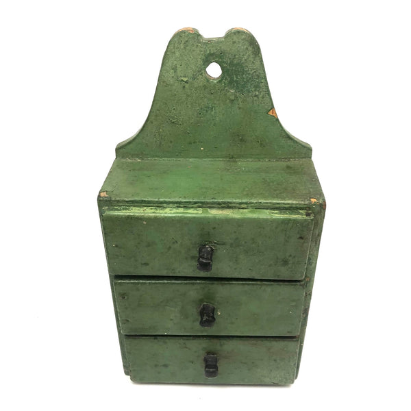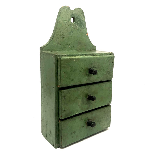 I purchased this one from a dealer in New Hampshire who always has great stuff---with this fantastic old green paint there was no way I could leave it behind. In the most delicious green paint, original to it and wonderfully crusty. The hand-carved black painted pulls on the three drawers are really quite delicious too, each its own, just the right amount of irregular and the perfect punctuation. All very sturdy and sound, with the drawers pulling out easily and closing flush, one if them with a middle divider separating it in two. I'd hang it in the kitchen or bathroom or somewhere I'd see it all the time--useful for spices, or bandaids, or small treasures of many sorts.