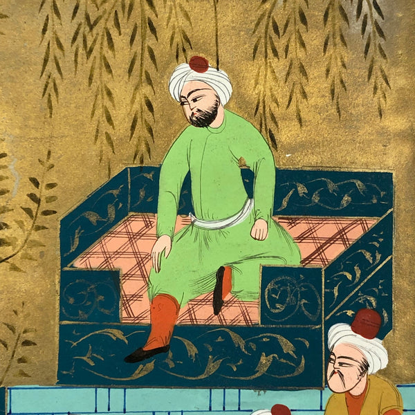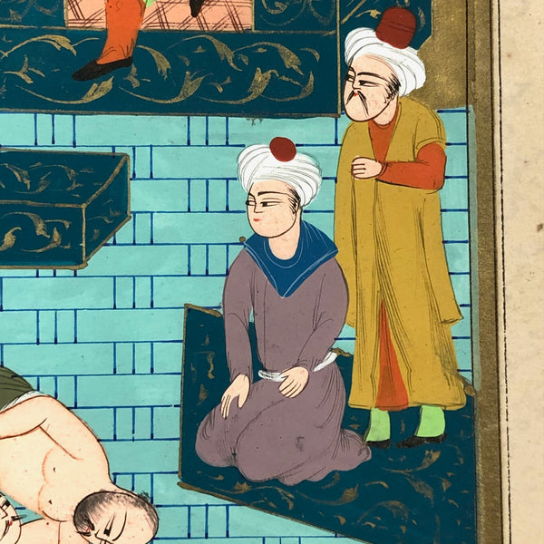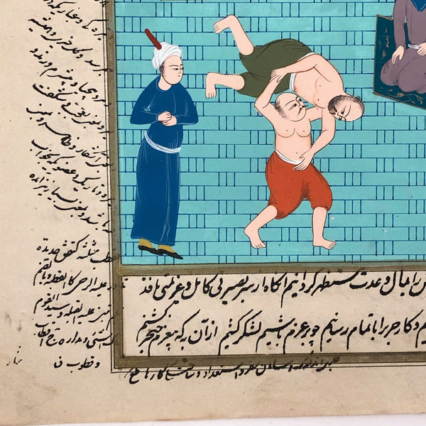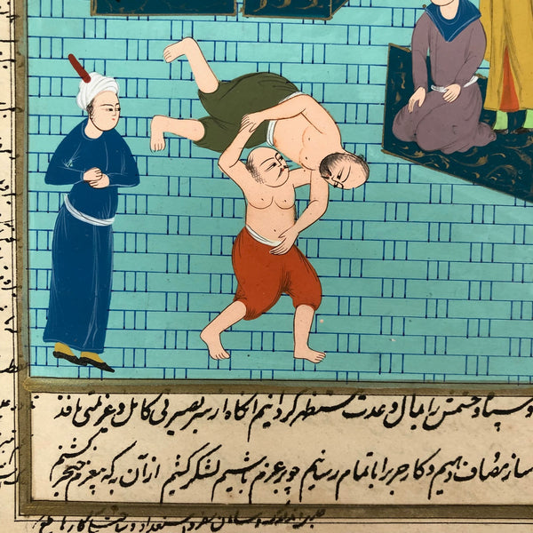 It's the pair of wrestlers on this illuminated manuscript page, Persian I believe, that really make it for me, though the gridded patterning on that bright blue floor, and weeping willows against gold, and lime green of the seated man's tunic really do it for me too! Gouache on paper, with terrific color and pattern and gestures throughout, earlyish 20th c. or so I presume.