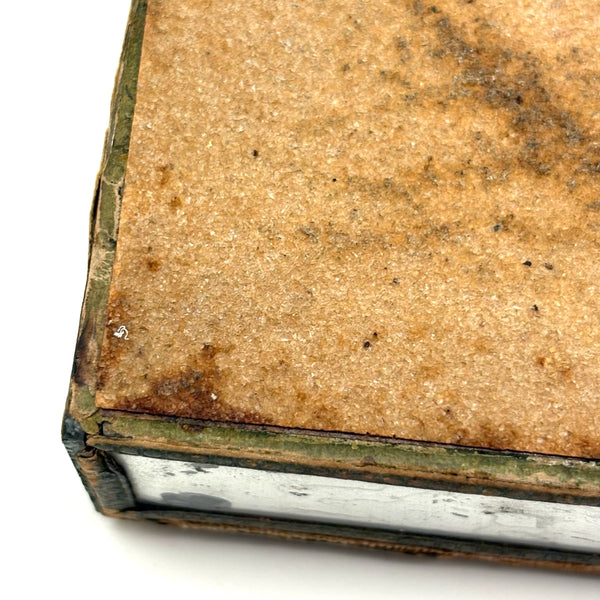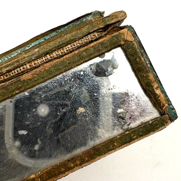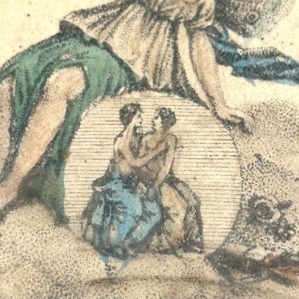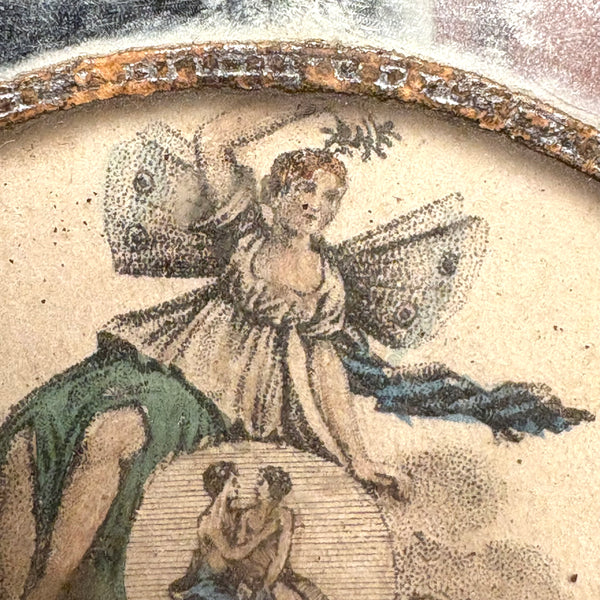 Some losses to the paper decoration on this small mirrored box, but I think it's quite a charmer, regardless--including for the fabulous hand-colored engraving framed at center of the lip, with this butterfly-winged fairly waving her hand (holding magic herbs or mistletoe?) over the canoodling couple below. One might expect this to be a trinket box, but the underside is sandpaper for striking, so I believe it was meant for matches--which defines our butterfly-winged woman as a fire-starter!