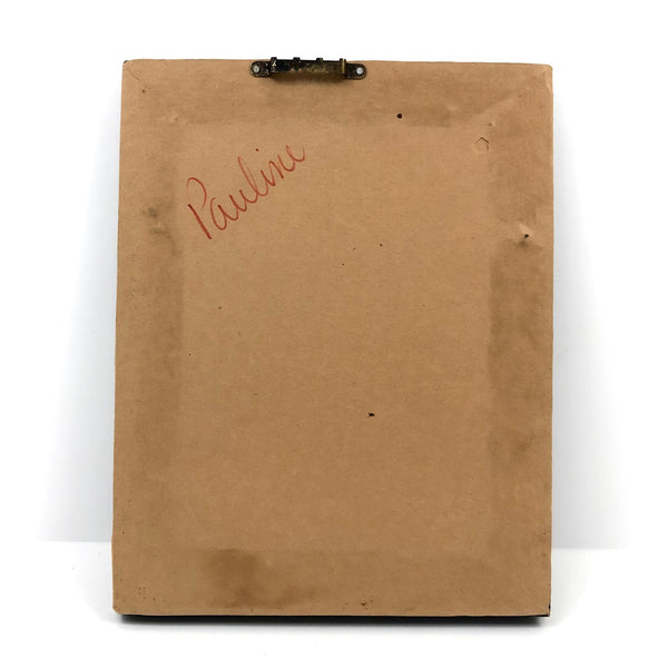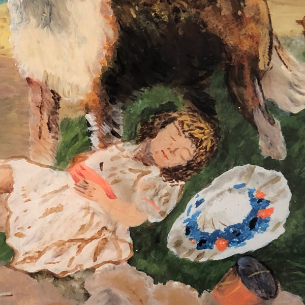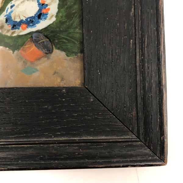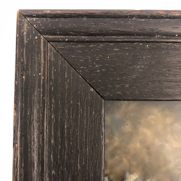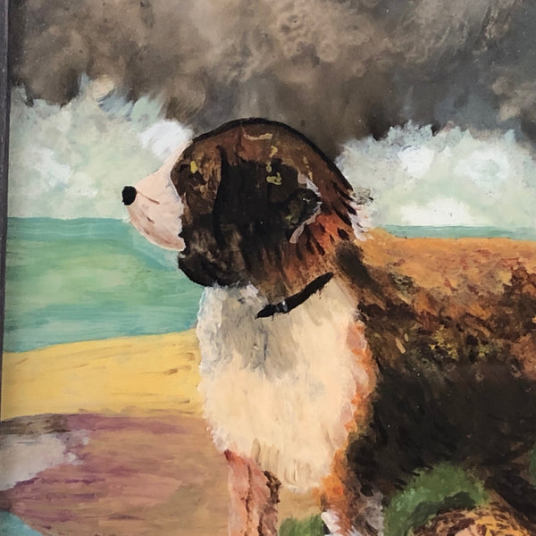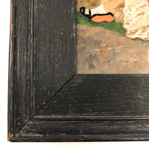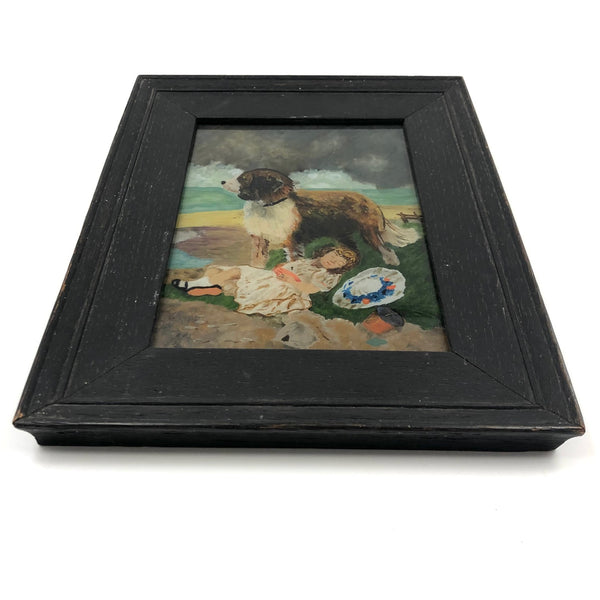 I have dreams of having a dog as big as I am, for all of the reasons this wonderful--Victorian era I believe--reverse glass painting captures; how nice to have this giant, loyal, protective creature watching over one, and over everything! The grey strom clouds looming on the horizon amplify the effect, all while this little girl dreams away, completely oblivious. Just great, and in great condition, in a perfectly suited old black painted wooden frame.