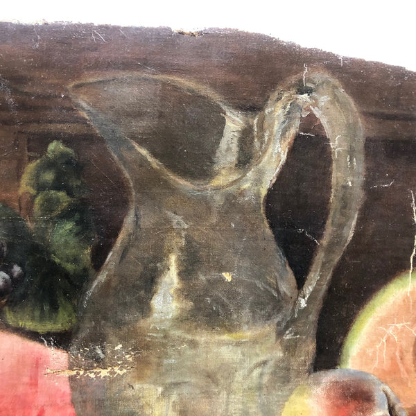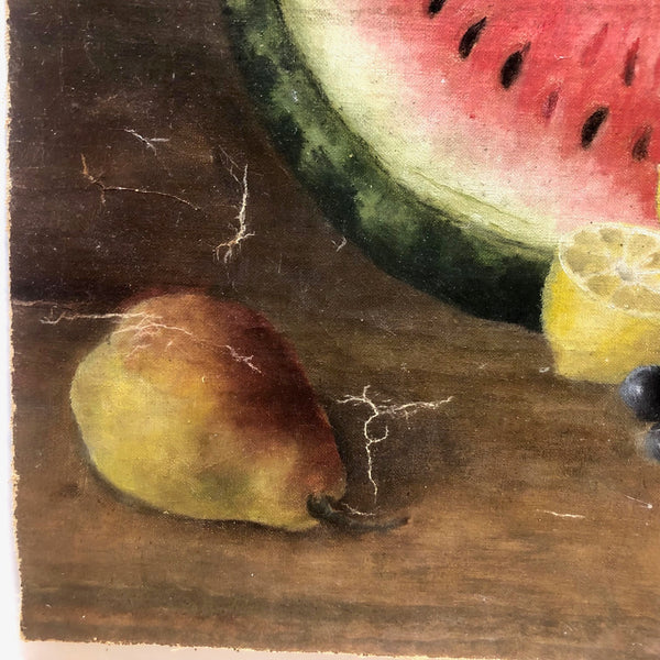 9 1/2" x 16 1/2". Oil on canvas with a clear coat over top. Later 19th c. I presume. Detail photos document condition well--with a rough spot where the watermelon meets the pitcher, and a few other areas of wear (lower right, and over the melon at far right.) I personally don't find these detracting but rather just part of the ambiance. Shipped flat.