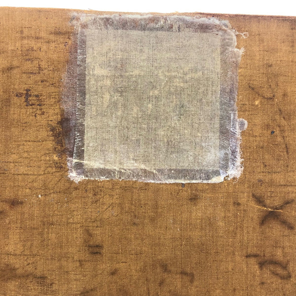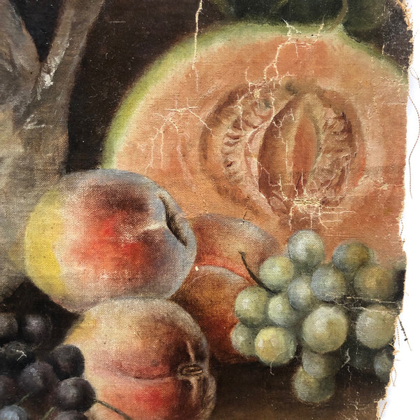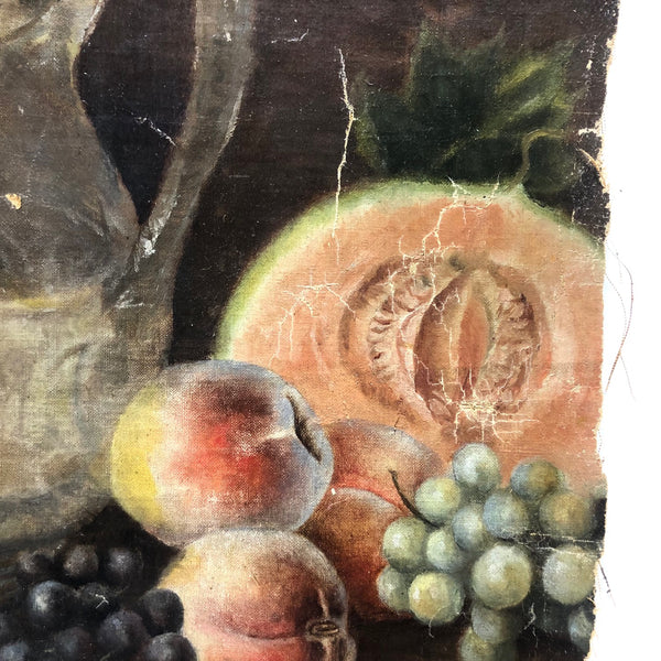 Yum yum! This 19th c. oil on canvas painting has been through it, for sure--unevenly cut from its stretcher at some point, and with a mend to the back of the canvas and a few other rough patches. But what a luminous still life of some very beautiful fruit it remains, with the pink glow of that watermelon completely doing it for me. I'd be inclined to pin it to the wall from the top corners just as its--close enough to taste it!--but certainly it could be framed as is, or backed with another canvas and stretched.