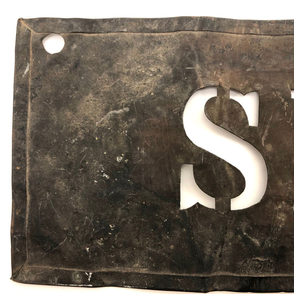 17 3/4" l x 4 1/2" t. In good condition, great patina, bends and small dings here and there, all to the good in my opinion, but the metal is soft enough to press pretty flat. I've photographed in two different lighting situations to give a better sense of the metal.