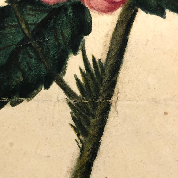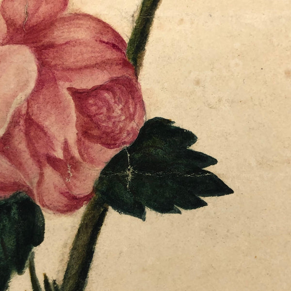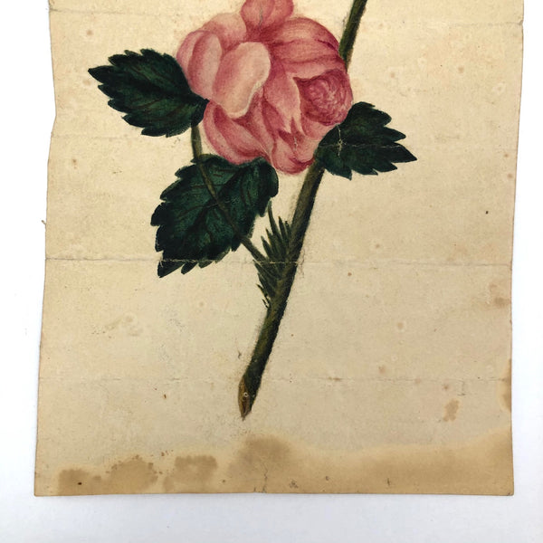 I just can't resist these old floral watercolors, and perhaps roses most of all--just such tenderly done things. I'd like to think this single rose was given to the object of it's maker Lizzie's affection, and that perhaps the five old horizontal fold lines meant she had to fold it up small and slip it inside a book, say, to deliver in secret!