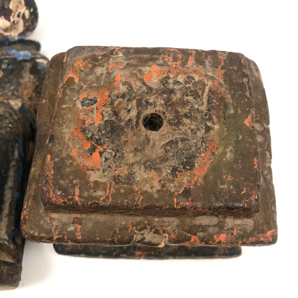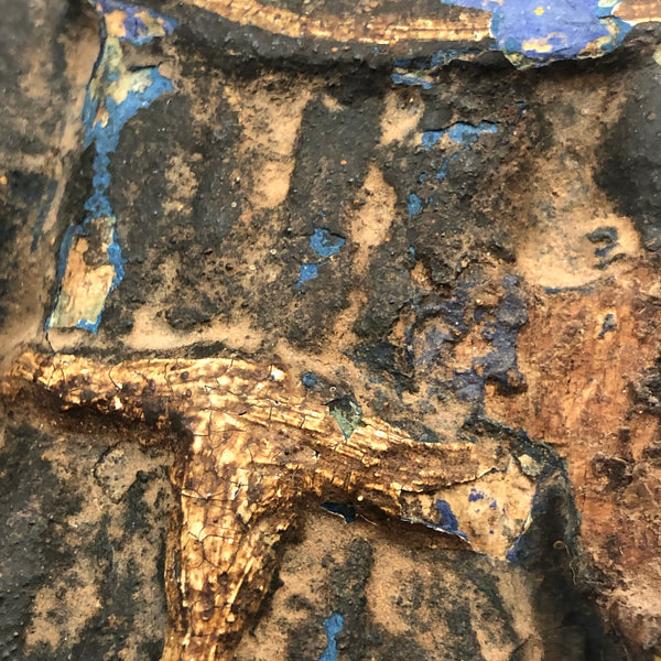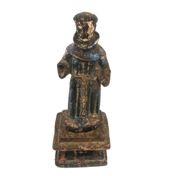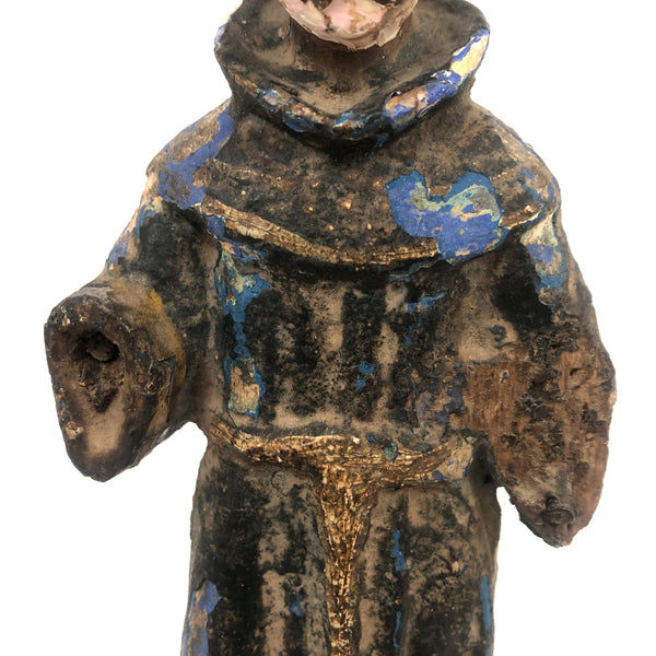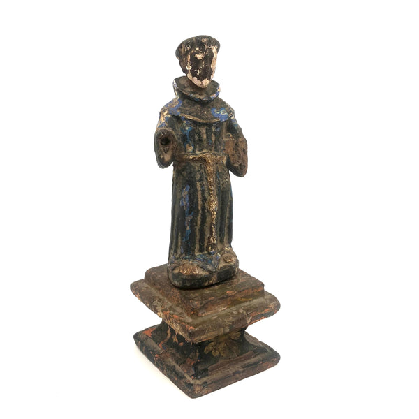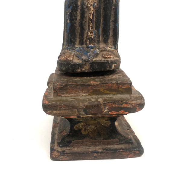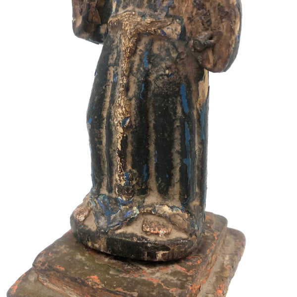 Though much of the paint on his face has been lost to time, I find this antique santos very beautiful, including for the glorious blue and gold paint still covering his cloak, and for his little bare feet poking out below it! And while its hard to sense from photos, the carved modeling of his face makes it such that one really doesn't miss the paint, or at least I don't. At some point a peg/post was added to the base of the figure that fits squarely into a hole in the pedestal--impossible to know if the base original to him, but its of equivalent age, beautiful itself, and suits him well--and he can be turned to face either direction as she stands atop it. I'd guess 18th c. continental European and think perhaps St. Francis but am not entirely certain.