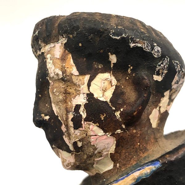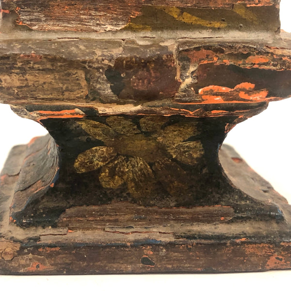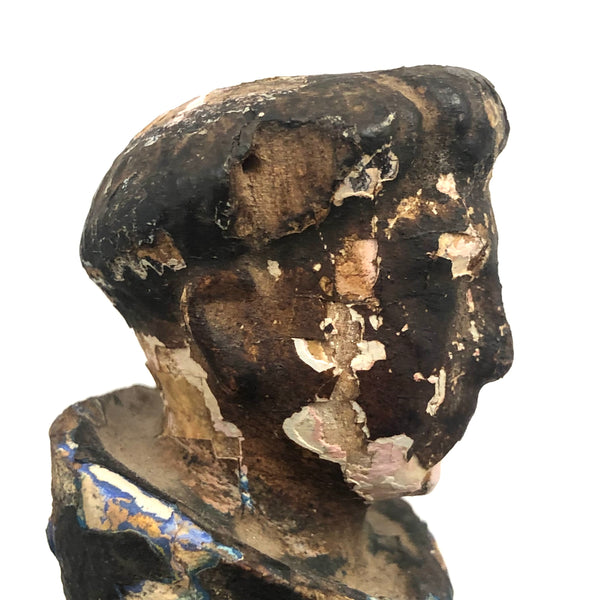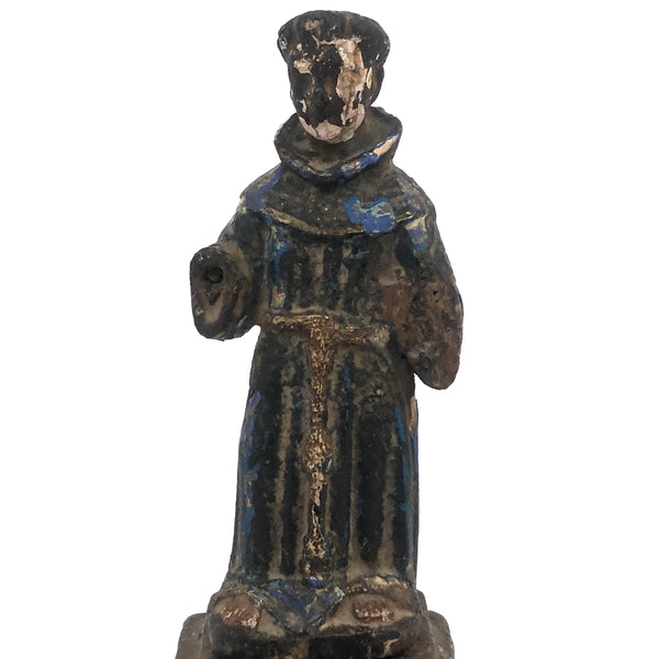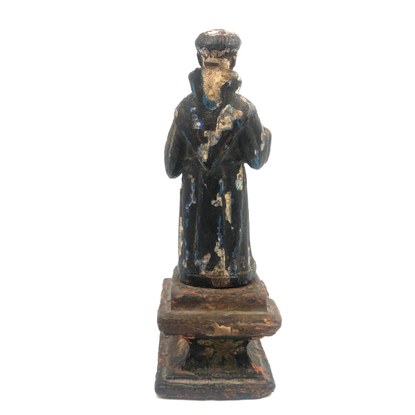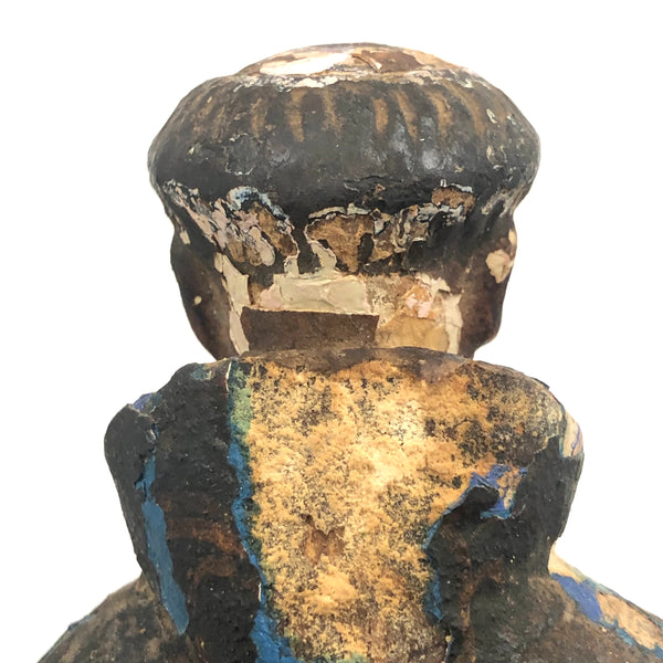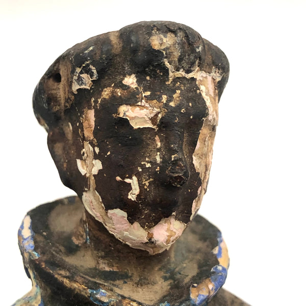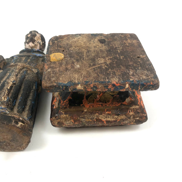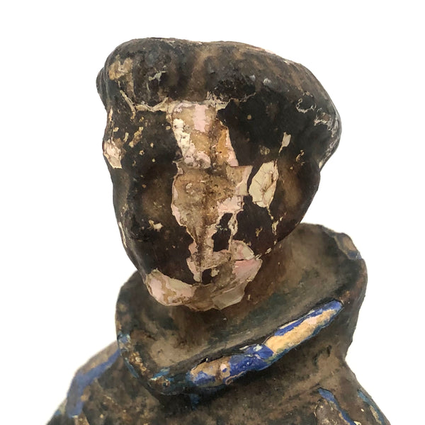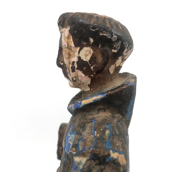 Overall: 9 1/4" t x 3 1/2" w (base) x 3 1/8" d (base.) Figure itself 6 5/8" t not including peg. Loss to arms long ago, paint loss and general wear as evident. Structural sound and not fragile.