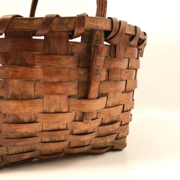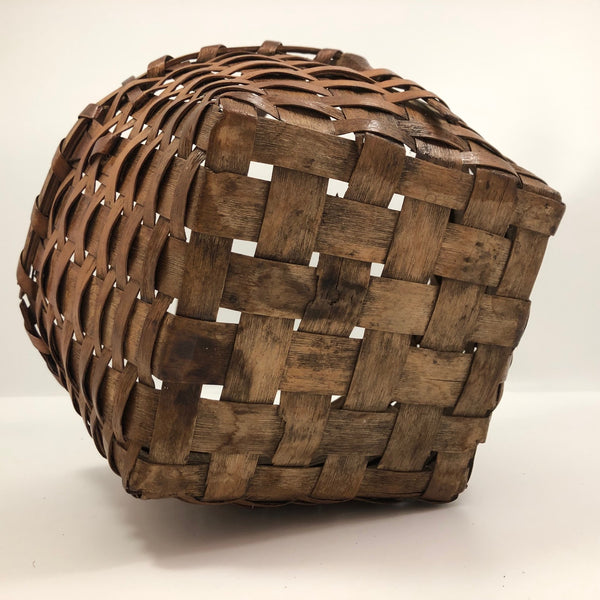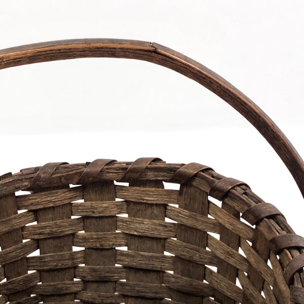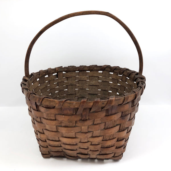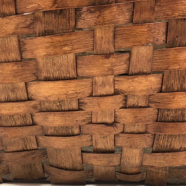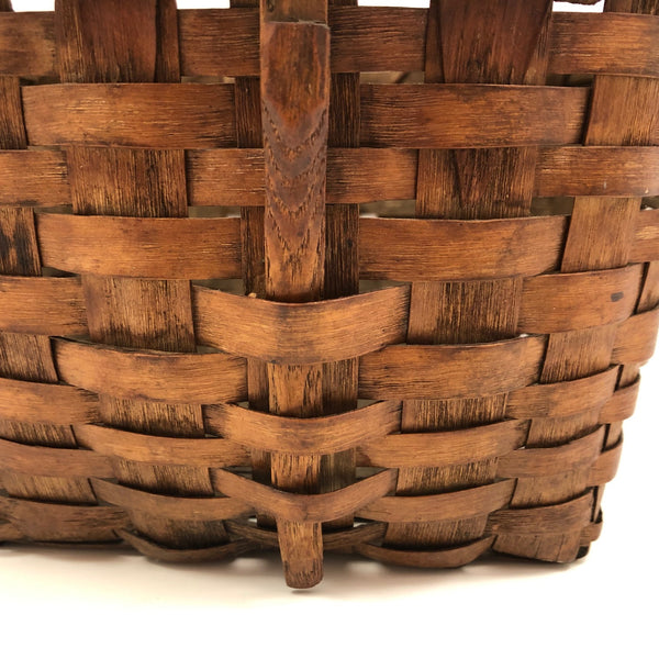 The basket measures 9 1/4" wide x 9" deep; 9 3/4" tall with handle, 5 1/4" tall not measuring handle. One end of the wooden handle has broken off near the tip such that it does not extend all of the way down the side of the basket--not very noticeable, and with no apparent impact on the strength of the handle. There is also a small split in the wood of the handle as it crosses the top of the basket--again very minor, and the handle remains strong. Otherwise, excellent antique condition.