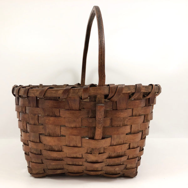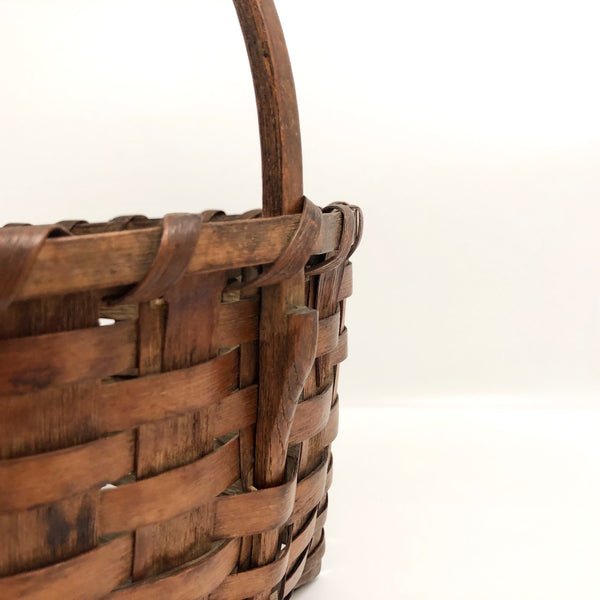 Photos do not do justice to the gorgeous warm sheen on this antique splint basket; this is just a super lovely thing. Late 19th century, I believe, it features a carved wooden handle, notched below the lip on each side and then woven into the basket as it tapers down the sides. This basket is pretty sturdy and could still be put to use gathering this or that, though I'd probably be inclined just to display it somewhere to be admired. I purchased it at an estate sale in Weston, MA that included many fine antiques.
