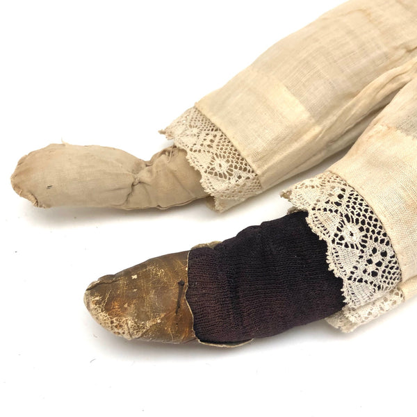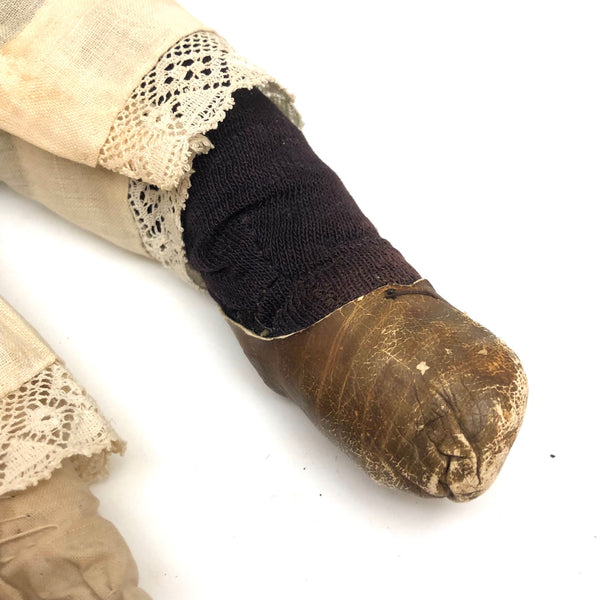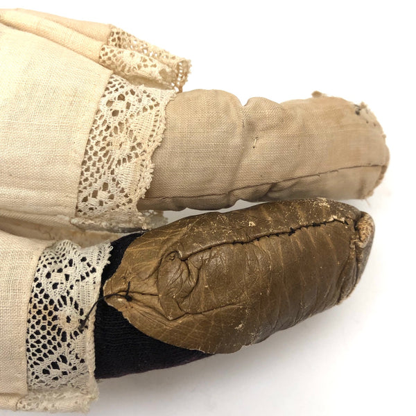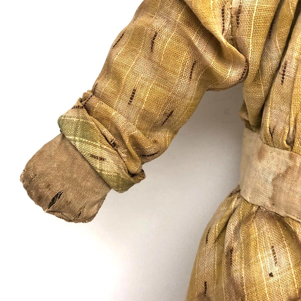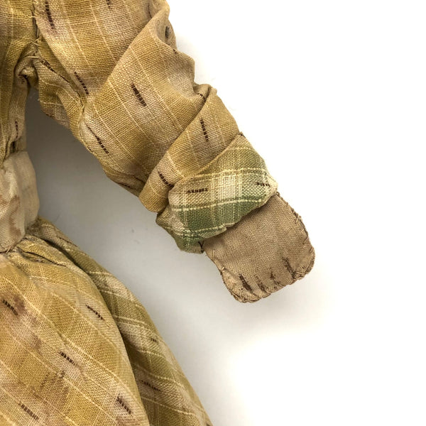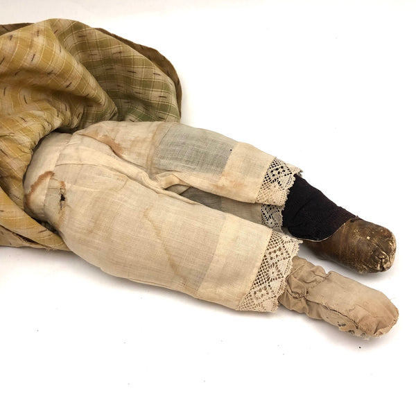 A very dear one, sewn of linen and stuffed of straw, with simple hand-painted face and coarse, natural gray hair (animal or human I'm honestly not certain) pulled through a woven fabric pate of sorts. She's been loved, with wear to the fabric of her face (showing another layer, stretched tight underneath) and the loss of one knit stocking and leather bootie along the way. With a pretty cotton woven plaid dress--showing yellow from the front, lighter green on the back, and the original stronger green from the inside--and nicely tailored pantaloons with lace trim underneath. C. later half 19th century, I believe.