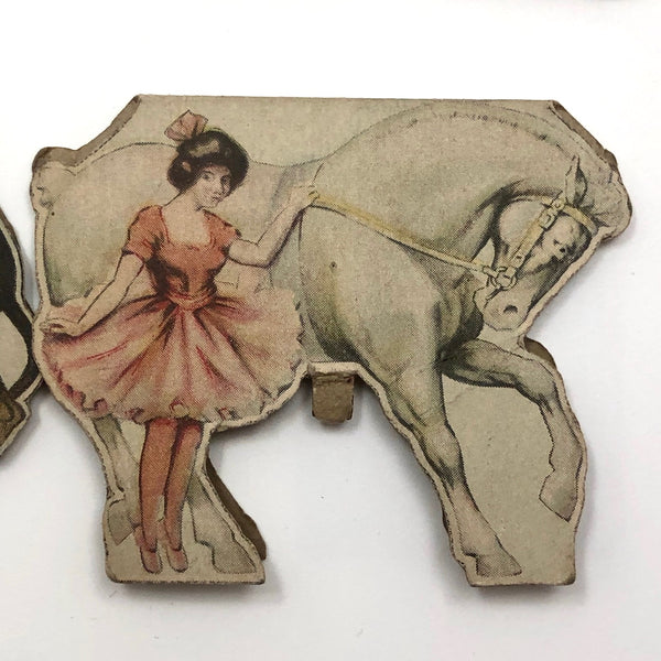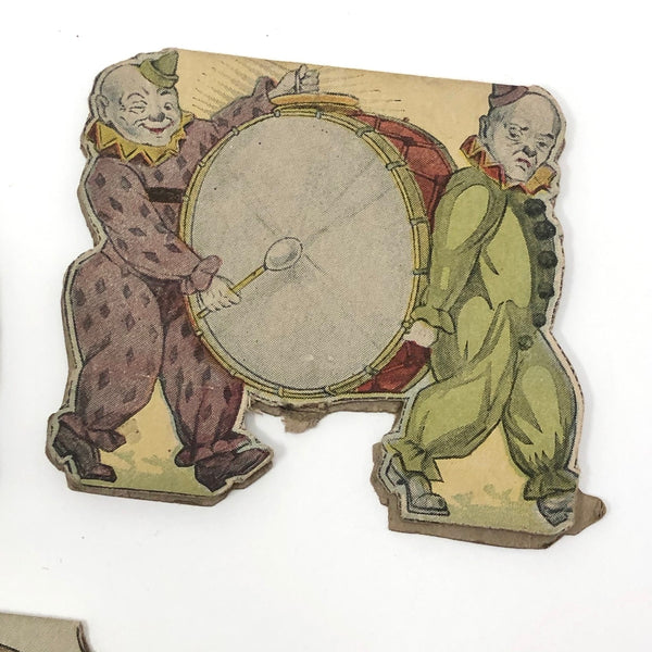 Color lithography on a nice weight cardstock, they'd be pretty great marching along the edge of a shelf or two or three, though could also be used as note cards as they feature blank interiors--or as place cards for a very fun and festive dinner party! There are fold lines along the legs of a few, as documented (happily, since they are double sided, you can turn them around to face in the other direction!) and remnants of center tabs of a few (I'd guess these were punched out of sheets), but overall they are in very good condition, and still bright and clean.