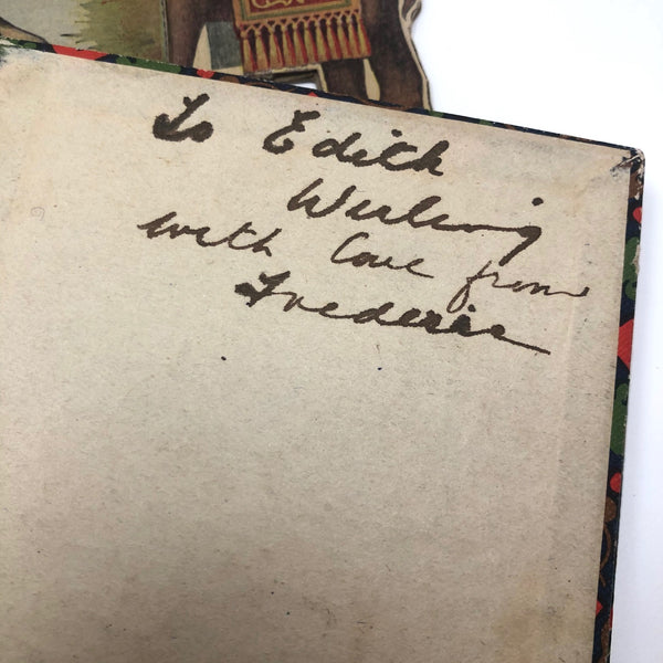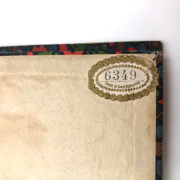 Animals measure approx 2 5/8" t x 3 1/4 w, give or take. Box, which shows some wear to the spine but is still holding together and very pretty, measures 7 1/2" x 4 1/8" x 1/2". There is a gold foiled "Made in Switzerland" sticker on the back of the box with the printed number 6349. And a handwritten inscription - "To Edith Werling with love from Frederic," I believe.
