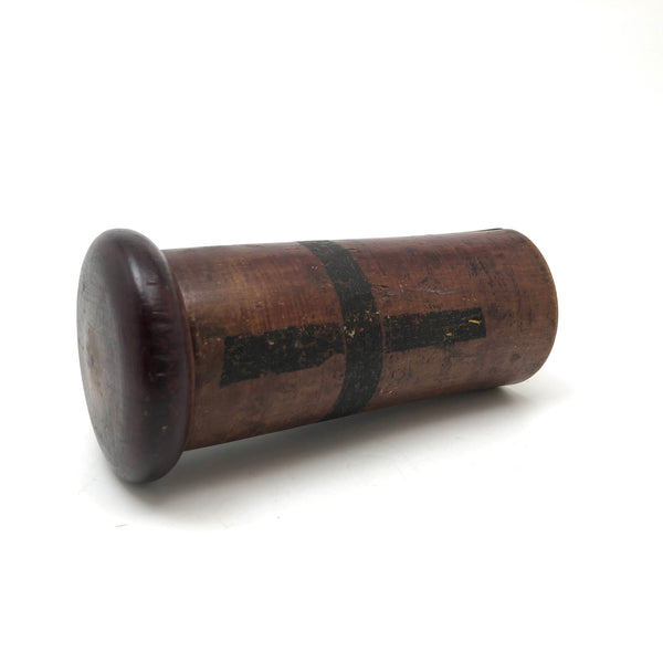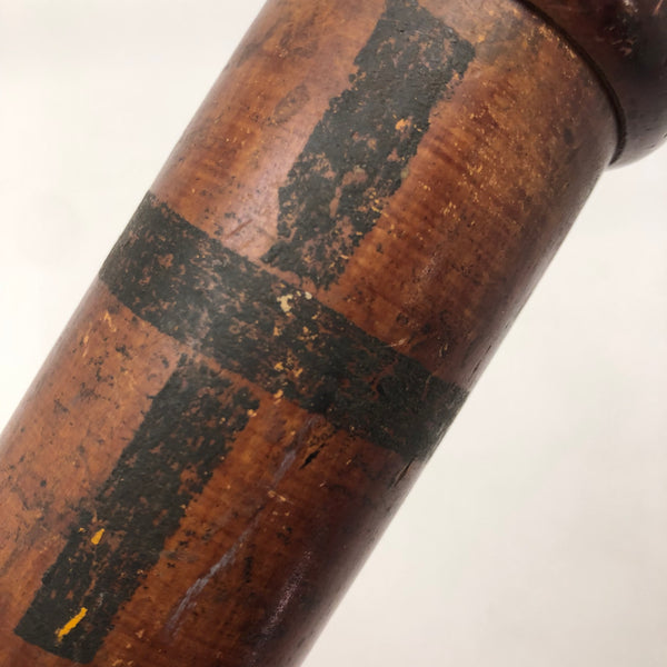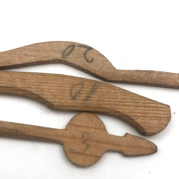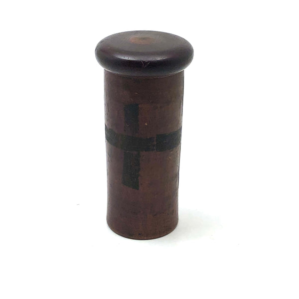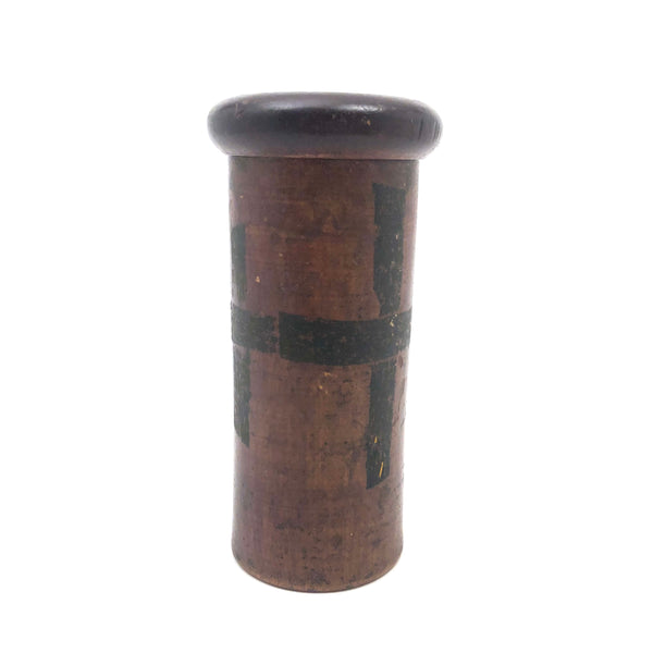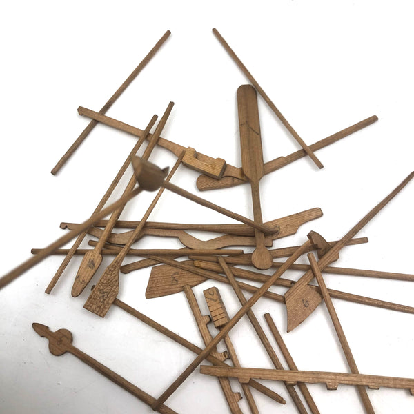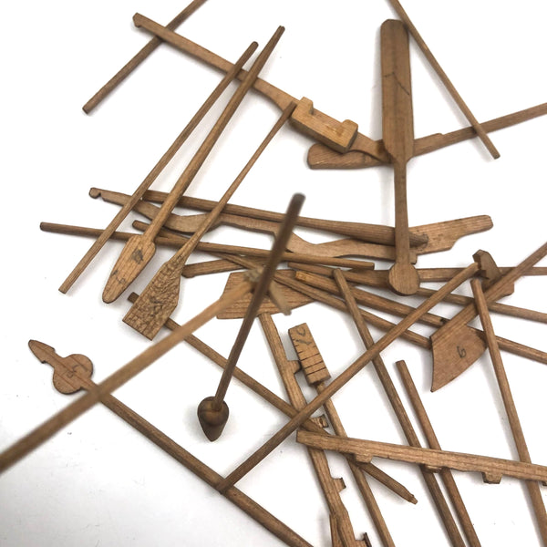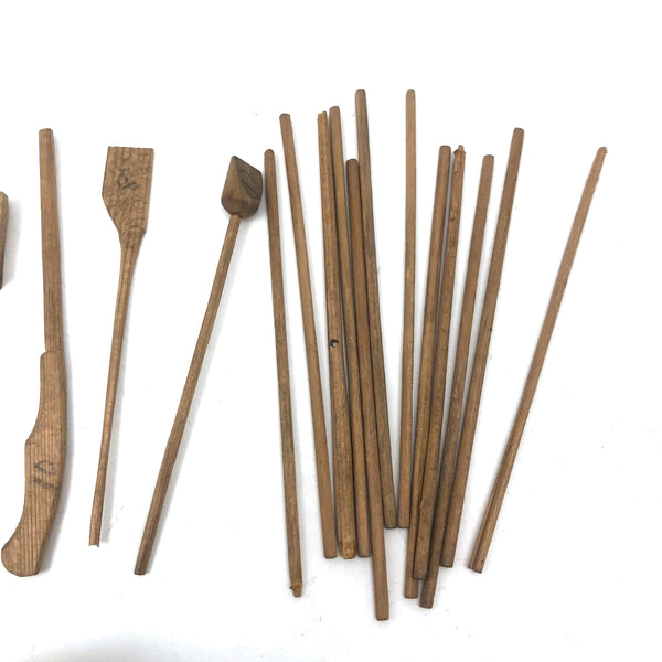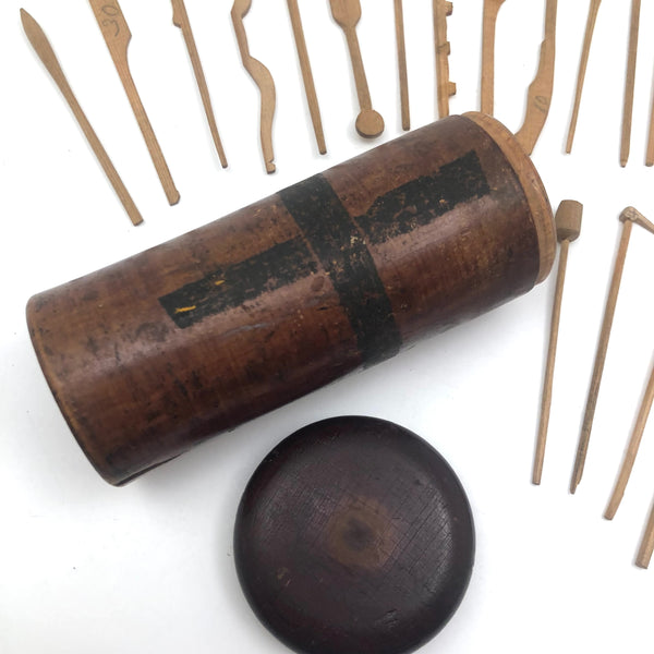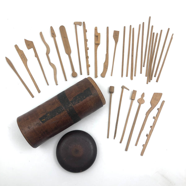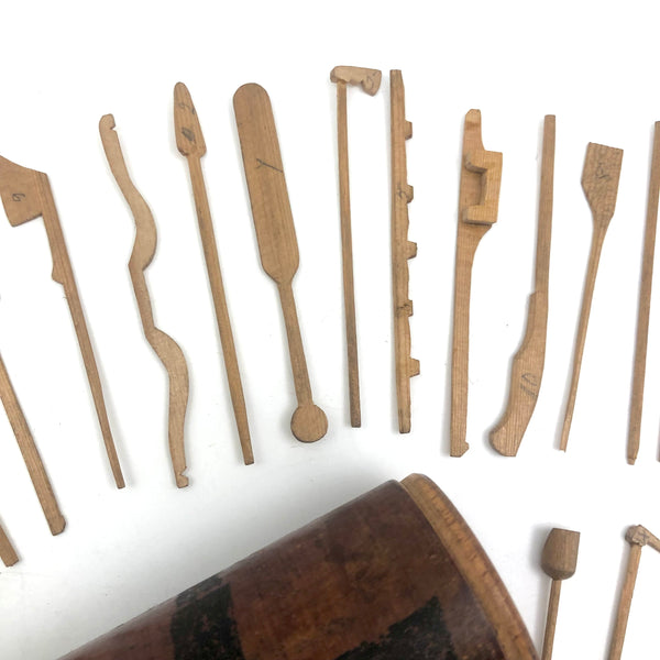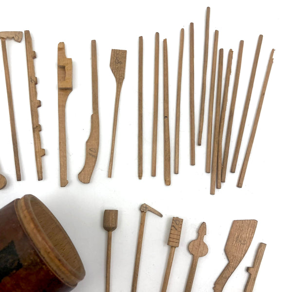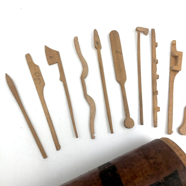 A sweet antique set of wooden spillikins, also known as jackstraws, played in the same way as pick up sticks--but much better for being shaped like tools and weapons--with the goal of extracting pieces one by one after throwing them out on the table. These old sets are labeled in pencil with point values (as shown in detail photos), with the archery bow especially valuable! A nice little set of objects whether or not one ever plays with them, and I especially like the turned wooden container for these, with old paint (or perhaps it is cloth tape residue) marking black crosses across its surface. A quintessential stocking stuffer if I ever saw one, just right for playing on Xmas day!