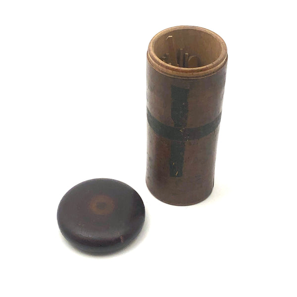 Box measures 4 1/2" t x 2 1/4" diameter at lid. All in good shape, with one hook-like piece that works pretty well for extracting the others from a pile.