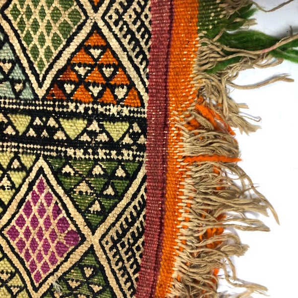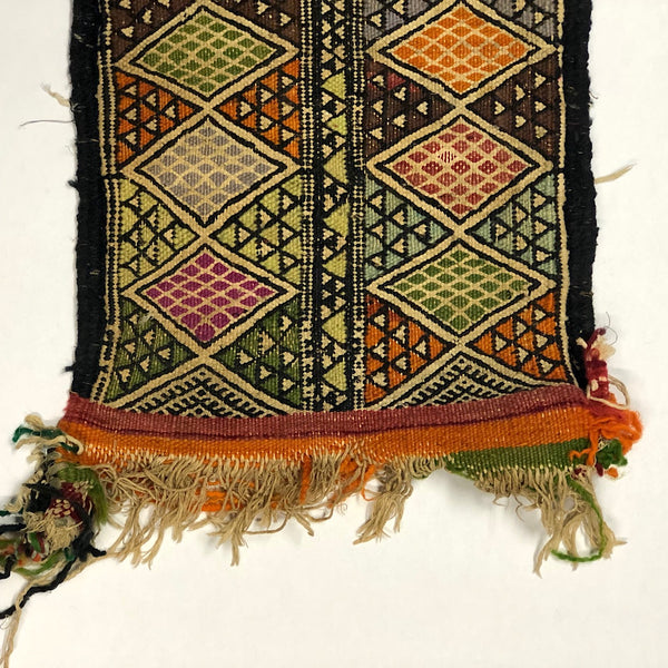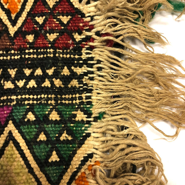 This piece I believe is a portion of an antique Middle Eastern camel saddle bag, which, as may be obvious, would have been used for traveling on camelback. Quite heavy for its size, this is truly an exquisitely woven piece, made with a wool weft on a cotton warp. The colors are vivid and the design I think just beautiful, with triangles comprised of triangles and diamonds of diamonds. The reverse side, which tells the story of its making, is pretty amazing too.