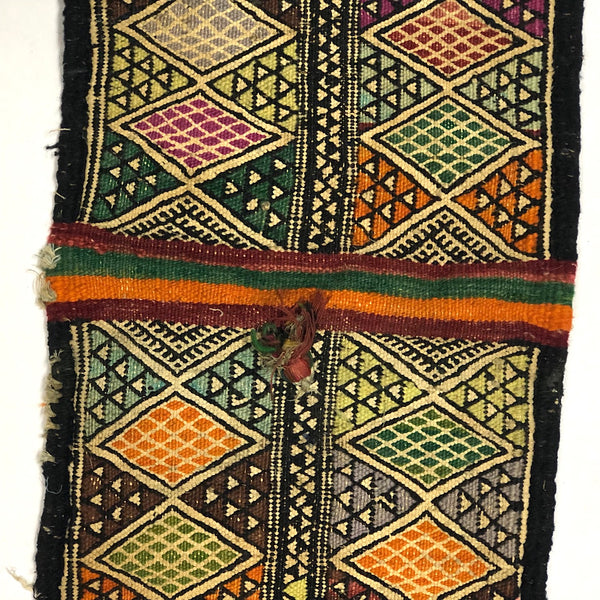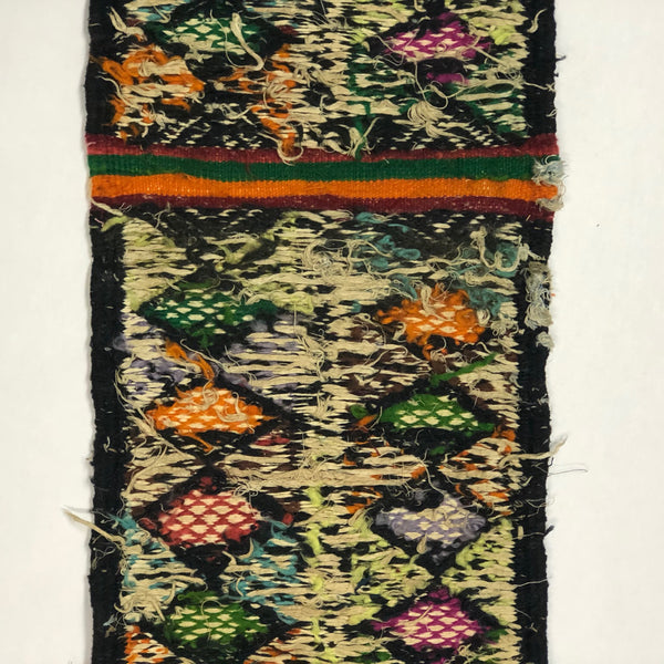 I would hang this piece on the wall where I could admire it everyday. It measures approximately 25” long x 10 1/2” wide. While the weaving itself is in terrific shape, this piece clearly shows its history, which I believe adds to its appeal as a truly remarkable object.