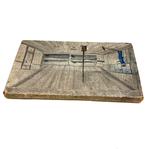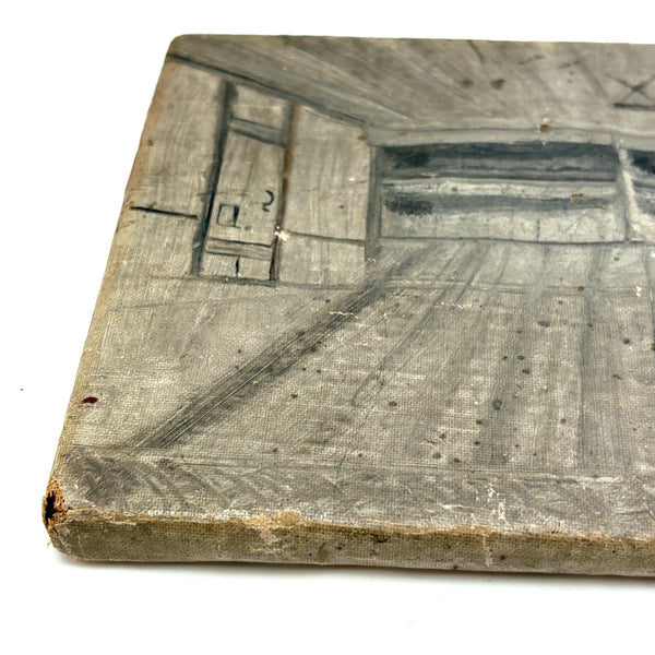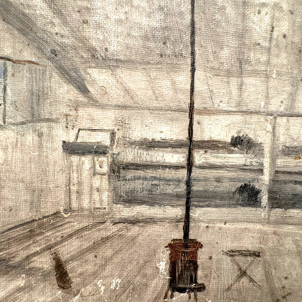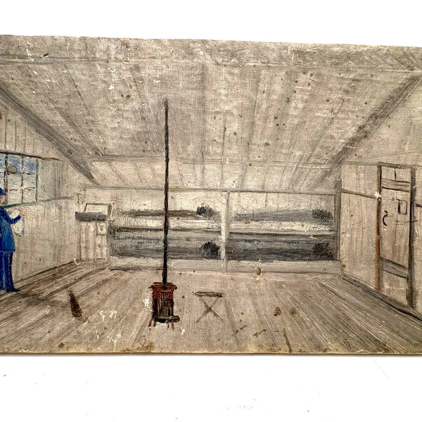 A curious one, which photos do no justice, and which I grabbed fast, along with a second by the same maker, at the New Hampshire Antiques Show and felt--feel--like I was really lucky to get; this is a quiet but super atmospheric little gem of a painting I think, which I can't stop looking at. What exactly I'm looking at I'm not entirely sure, but I love the architecture of the space, with this lonely and not especially effective looking stove with very long pipe at the center, and what looks to be a view of a gray, tree dotted landscape, perhaps with railroad tracks running through it, at the far end. And surely out man in blue is wearing a uniform--I presume military, which the second painting by the same maker would seem to reinforce. (That one of a small cabin, with sign on the door reading 4th Sec. Co. H). Holding up a piece of paper in his hands, feels like a very solitary moment of planning and waiting to me, sheltered but cold and far from home, with just a small glimpse of blue sky. SO much better in hand.