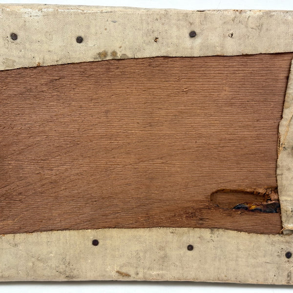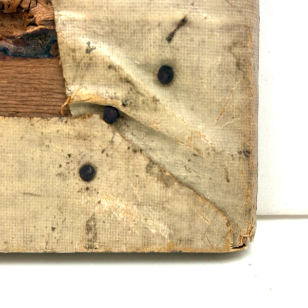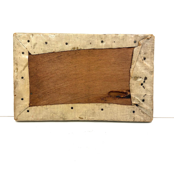 8 5/8" x 5 3/8". Oil on waxed canvas, wrapped around wood, with that waxed surface lending it a really wonderful sort of luminance and specialness. Very good condition.