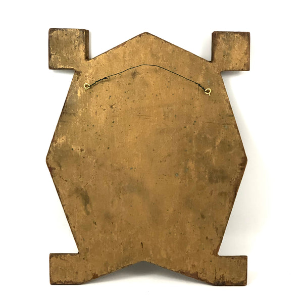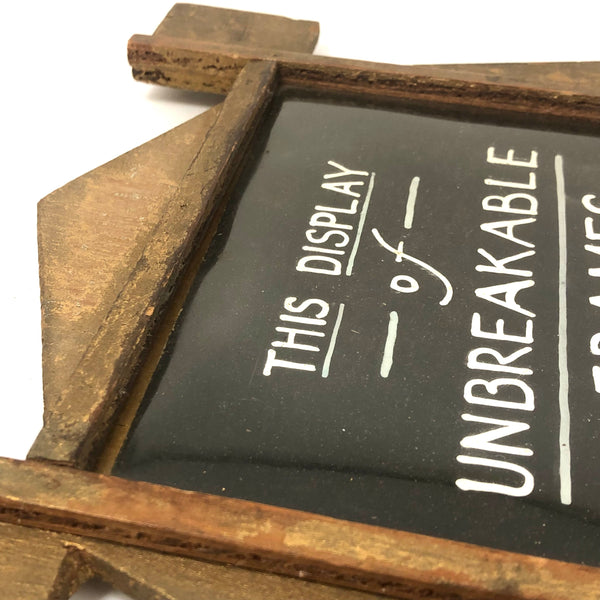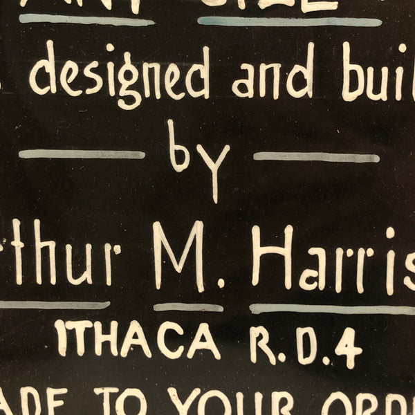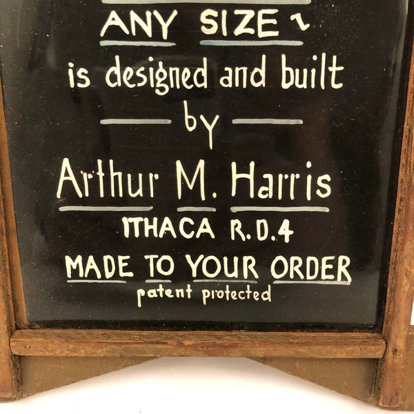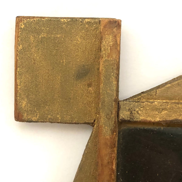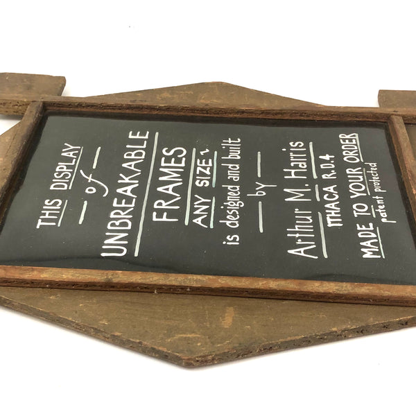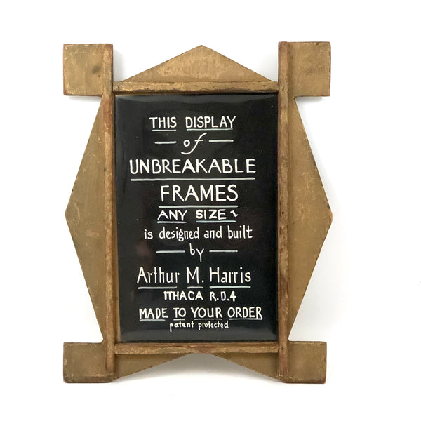 A fun one--the unbreakability of which I have not tested, but it's definitely sturdy! I haven't turned up anything definitive about an Arthur M. Harris who was a frame maker, though I did find an Arthur M. Harris of Elmira, NY, 1850–1916, which could be right. A terrific folk art frame, whatever the case, now a mellowed gold, with Harris' excellent hand-lettered salesman's pitch still inside.