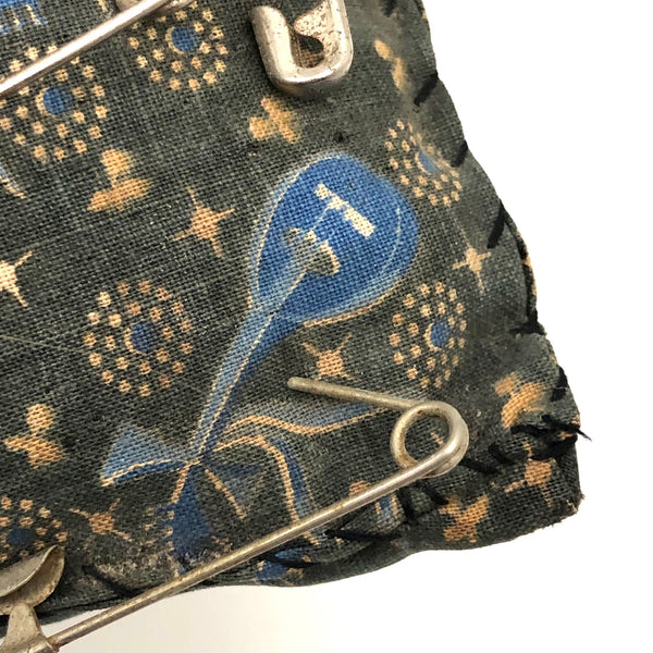 5 7/8" x 4 1/2" not including loop. Good condition, seams tight, no holes other than pin pricks. Sold exactly as found. Nice fading/softening to the color of the fabric on the facing side, brighter on the underside.