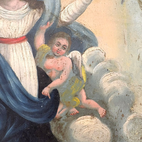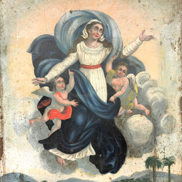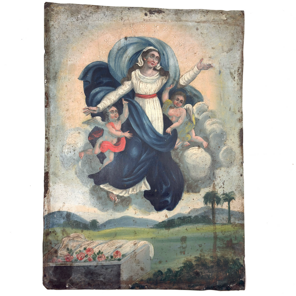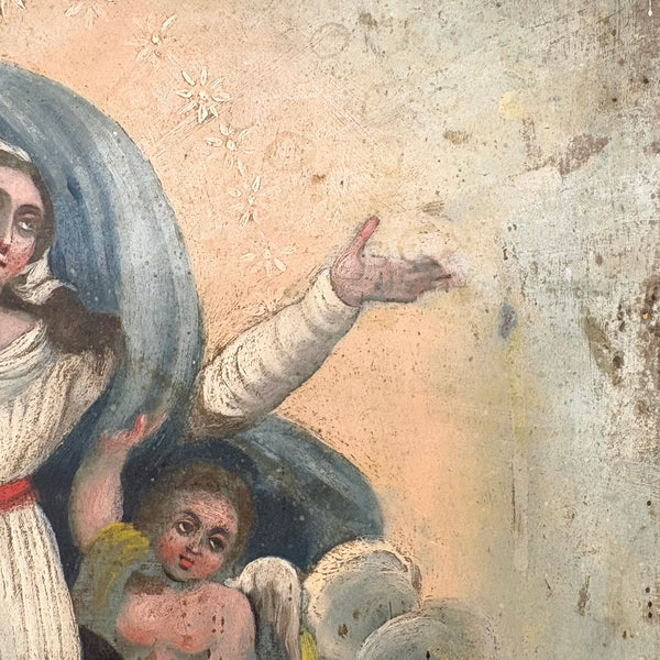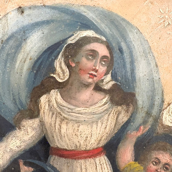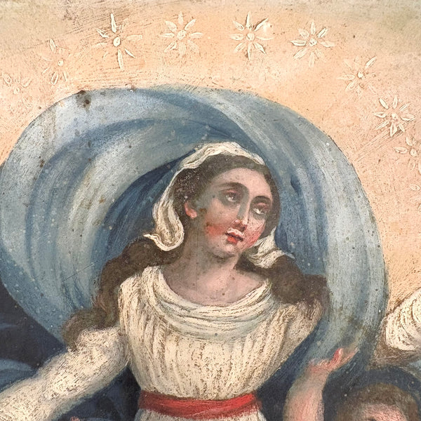 Assumption of the Virgin, Beautiful Antique Folk Art Retablo on Tin