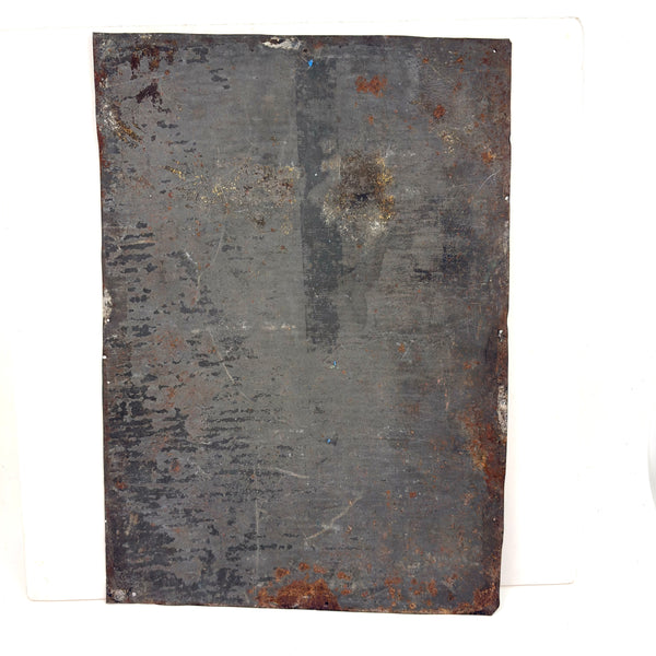 13 7/8" x 9 7/8" and in good antique condition, 19th century I believe. Some uneveness to the shape of the tin and some light rusting and paint loss around the edges, all to the good I think.