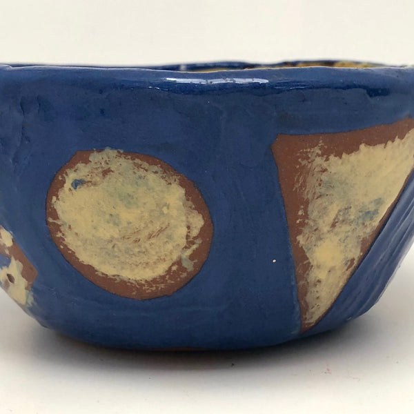 I really love this little bowl, which I assume was made by a kid, but one with a pretty hip sensibility, as its yellow lightening bolt, triangle, circle etc against glossy electric blue are super sharp. The heights of the sides are a bit uneven and the application of the glazes far from precise, which just make it better. Great as a cat bowl, or a candy bowl, or whatever!