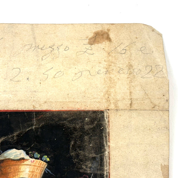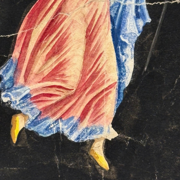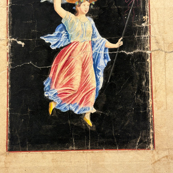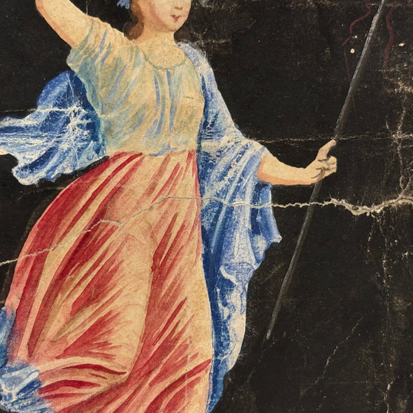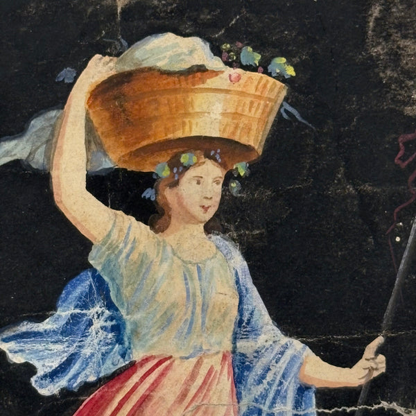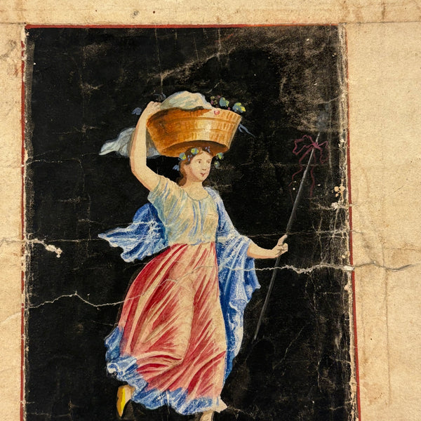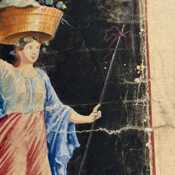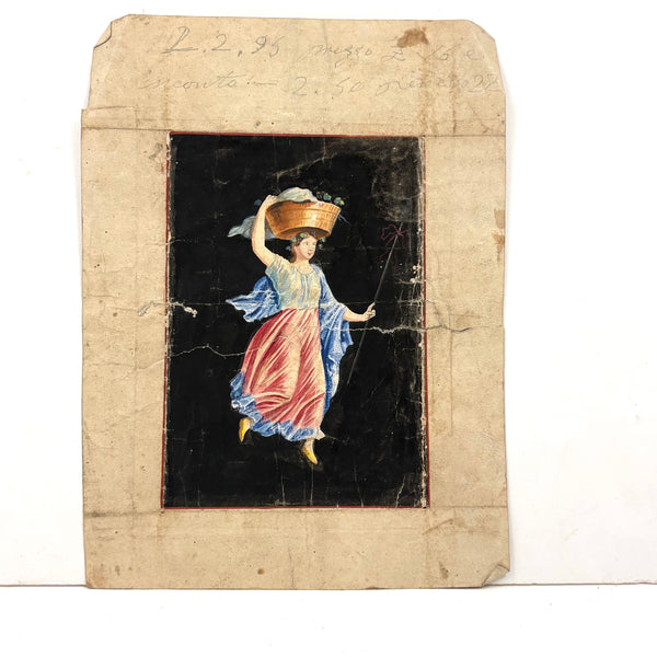 I believe this 19th century Italian gouache/watercolor was someone's Grand Tour purchase; some notations in graphite at the top of the paper seem to have recorded the date of purchase and what was paid, but it's a but hard to decipher. (I think maybe the year of purchase was 1895, though I believe the painting is likely a bit older than that.) This allegorical "baccante" (follower of Bacchus) with basket on her head (filled with grapes I believe) and staff in hand, was a popular subject, based on a fresco at Herculaneum. An excellent vehicle for painting drapery, and I especially love the bright yellow shoes on this folky iteration!