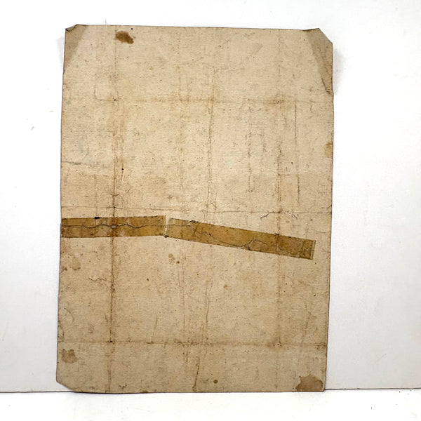 Paper 9 3/8" x 7". There is an old tear down the center, tape repaired from reverse a long time ago. For me, this one is a whole lot about patina, (now very soft old fold-lines suggest it was carried around in a pocket or tucked into a book or letter long ago) so the tear doesn't bother me a bit. Color remains strong and lovely.