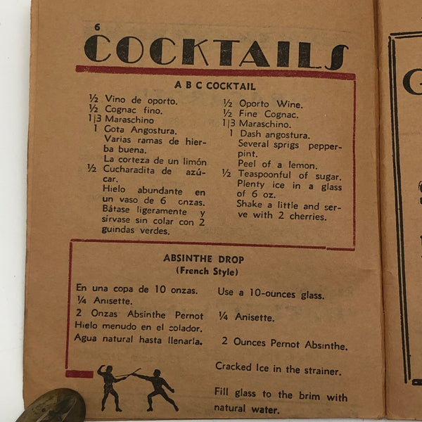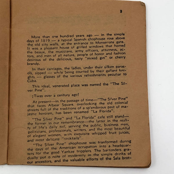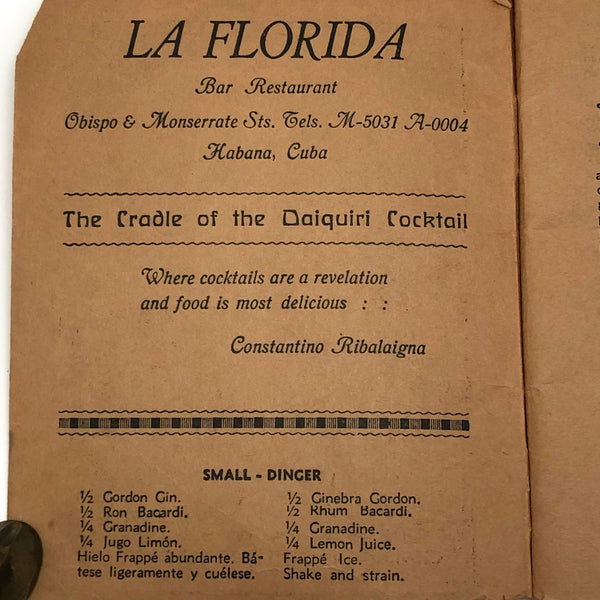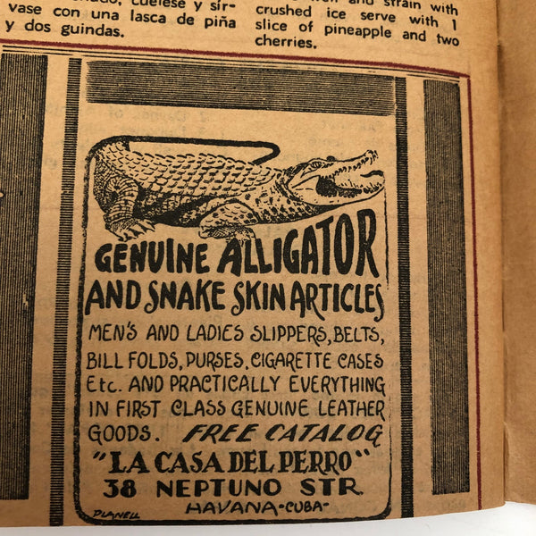 This is the original 1935 edition of the guide (similar, highly collectible, booklets were published in 1934, 1936, and 1937.) It is pretty fabulous, with recipes for cocktails from the Absinthe Drop to the Ramos Gin Fizz interspersed with ads for El Encanto Department Store, Genuine Alligator and Snakeskin products, La Estrella candies, and the Munson Steamship line with service from New York to Havana. Plus an introduction that tells the history of La Florida—located on a “glorious corner of Havana” previously occupied by “The Silver Pine” and now transformed into “a refuge of Art and Poetry”; and argues for the vital importance of the well crafted cocktail: “The cocktail is spiritualism!”; “It is like the slender perfume of a rose,” “the sweet symbol of a high and elaborate civilization.” Well, there you have it!