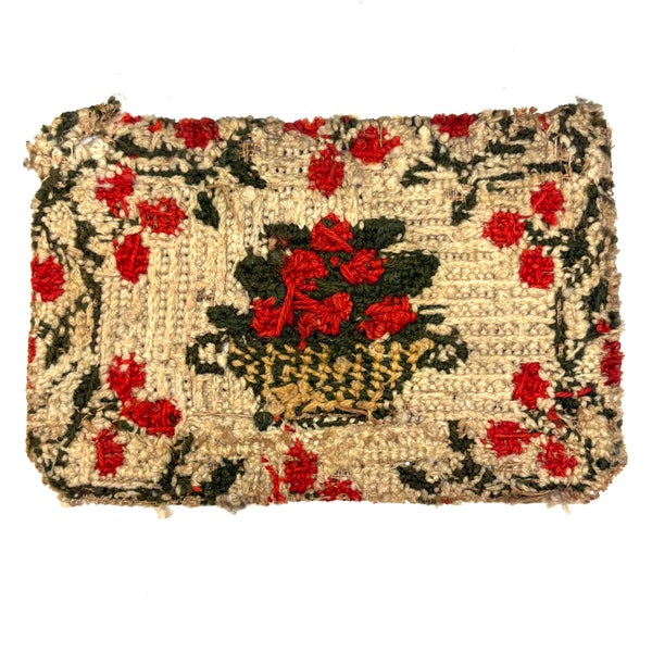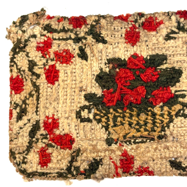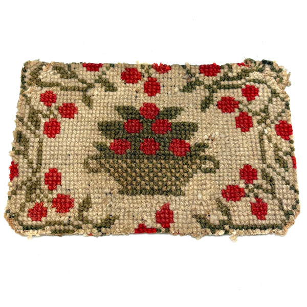 Basket of Red Berries, Charming c. Mid 19th Century Small Needlepoint in Hand-dyed Wool