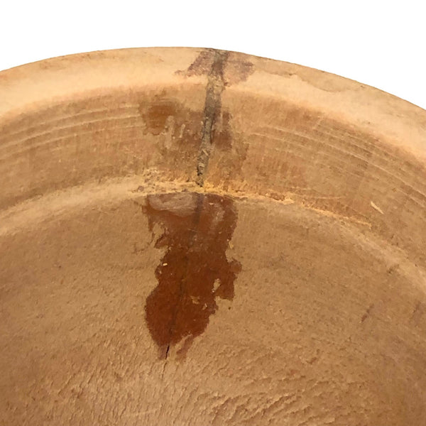 3 3/8 t x 2 5/8” d. There is one old repair on the back side as documented, but otherwise in great condition, really a lovely one. Opens easily and closes tight. (Last photos include another treen box, listed separately.)