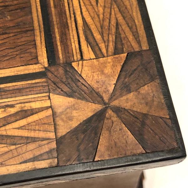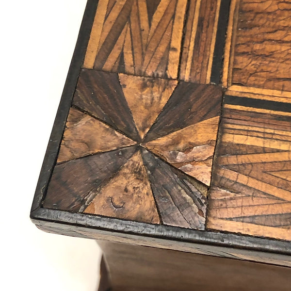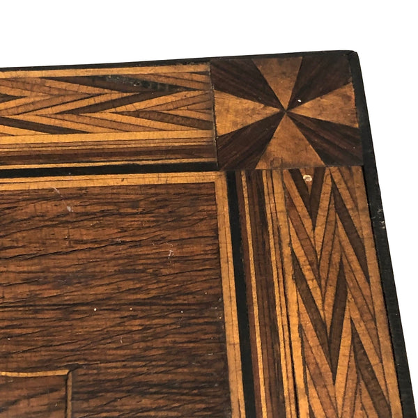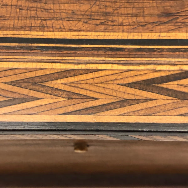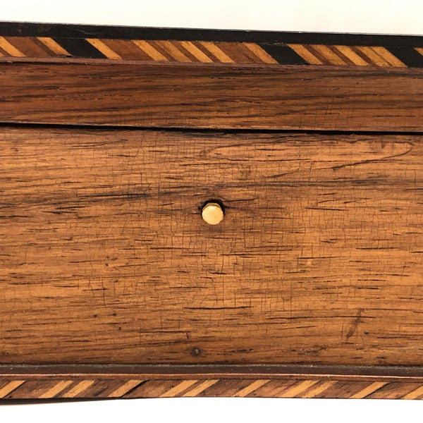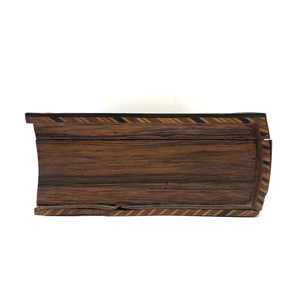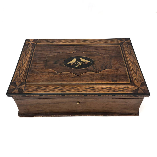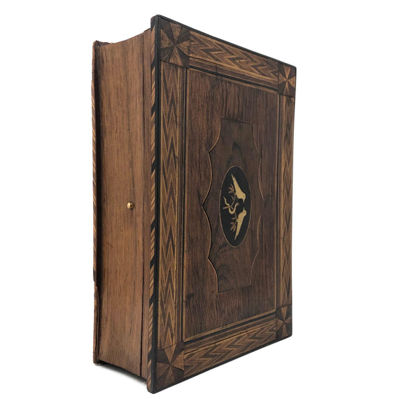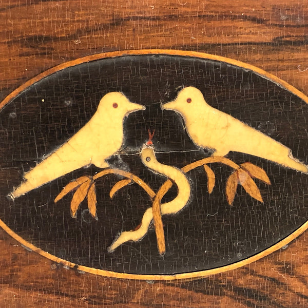 A stunner! It's the pair of birds perched on one split branch with snake wrapped around it that drew me to this beautiful box at first (I suppose it could be a worm, but it has a split tongue, so I do think a snake)- carved of bone I believe and perhaps sailor made. But then every inch of this box holds further charms, revealing itself to be shaped like a book, and with painstaking inlay work along all of its edges, and a bone push-button closure on that still clicks closed and opens easily by pressing. There is a little minor loss, but it remains really in excellent condition, with hinges tightly attached and the variety of woods all still just beautiful. Late 19th/very early 20th century I believe and very finely done.