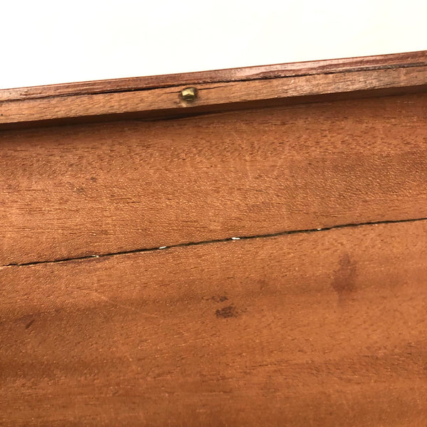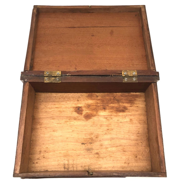 9 5/8" l x 6 7/8" w x 2 7/8" t. Very good condition, with flaws thoroughly documented. There is a split on the interior of the lid that shows inside the box, but it is double layered on the top so it does not show there.