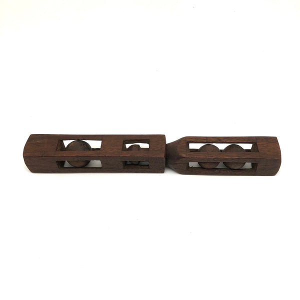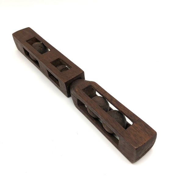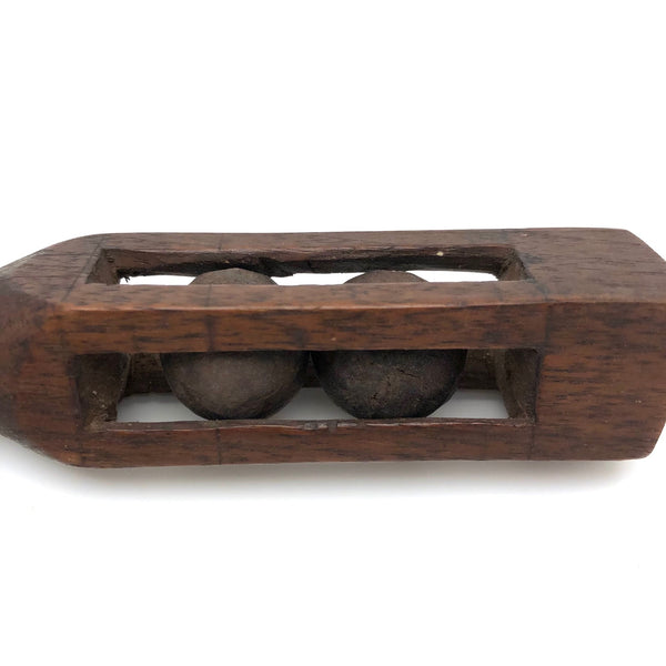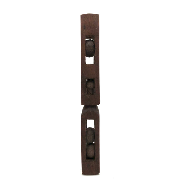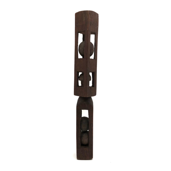 I love carved whimsies that feel like tabletop-scale architectural towers as this one does, even better for being able to rotate one section independently from the other. I also really love the way the handle of the piece housing two balls reads as yet another ball in cage as it locks into the other piece. Very nicely carved of walnut and found in Adams County, PA.