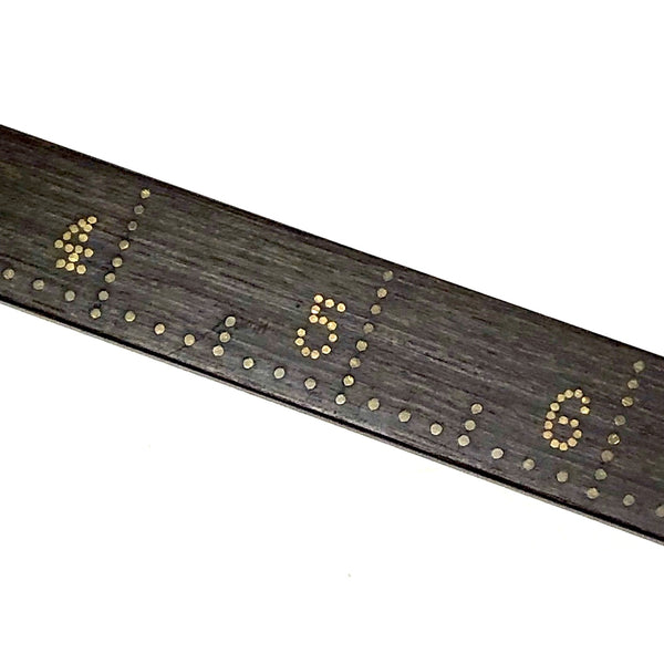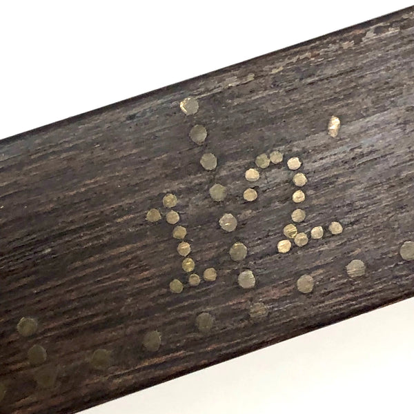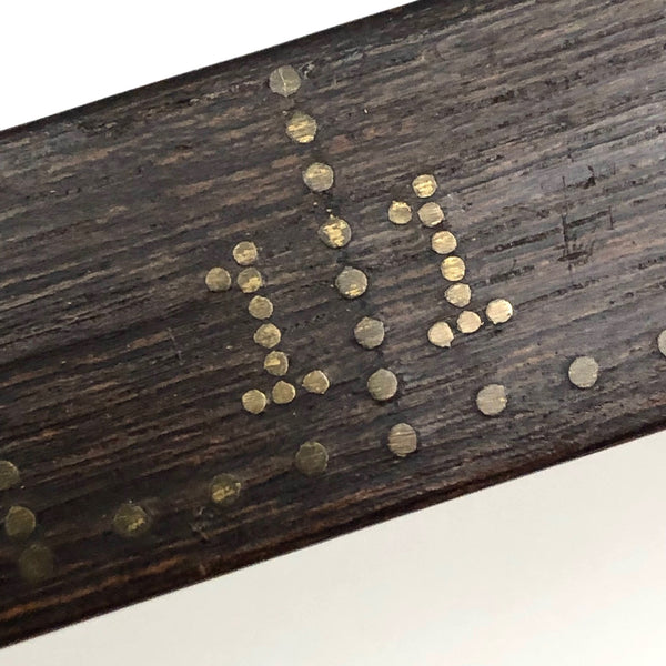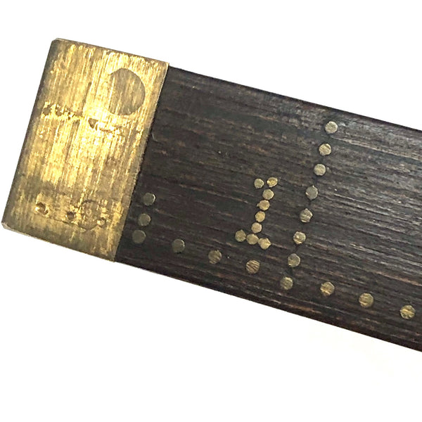 The first thing this lovely ruler made me think of was antique treen snuff boxes finely decorated with tiny brass nails, and this feels very much of that ilk--as well as reminding me of Victorian pin cushions with phrases spelled out in stick pins that I am forever coveting! I believe it is likely British, I think the wood is rosewood, and the nails were individually inlaid—with the added benefit being that one can feel the numbers with the tips of the fingers, so this would be the perfect ruler for someone with limited sight! I’ve found some mention of rulers in this manner as used by dressmakers, but I'm not completely sure. My guess would be late 19th c. or so. So pretty.