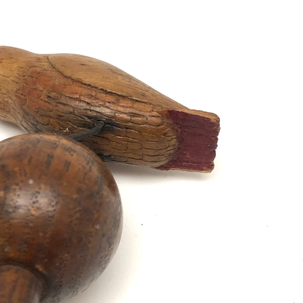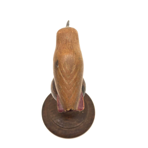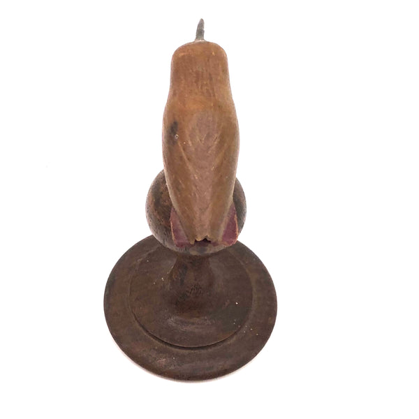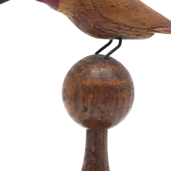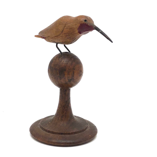 It's been a great summer for hummingbirds here, buzzing around all over, but also forever buzzing away..nice, then, to have one anchored in place! And an elegant old carved one this is, perched via wire legs atop a turned wooden base with bulb atop, as if it were sitting atop the world. With dark red paint on its throat and under it tail feathers, and very nicely carved detailing. To actual scale I believe, and very much capturing the spirit of the creature.