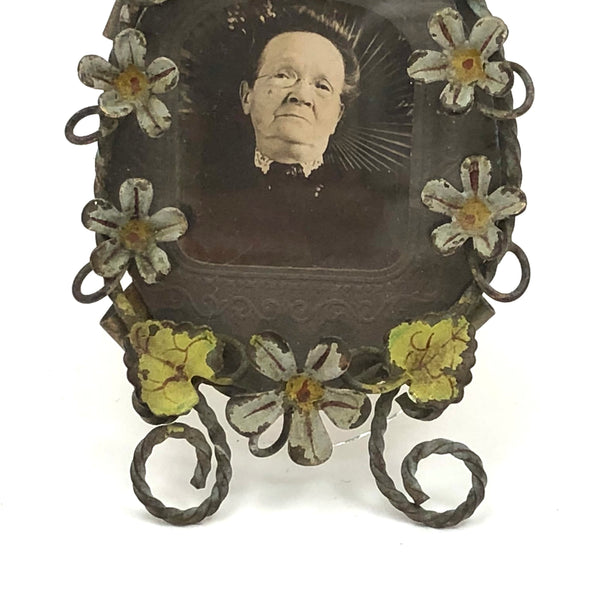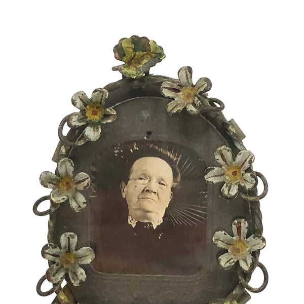 To my eye a complete charmer of a an antique miniature portrait frame-and all the more so for the photo found in it! Purchased the same week that Maggie Smith died, the woman (I think) in this portrait made me think a bit of her, looking none too easy to please! I also like the sort of halo of radial lines surrounding her head, doubled by the hand-painted wreath of flowers granted her by the frame. Great together, but the frame, really a sweet one, could easily be used for another portrait.