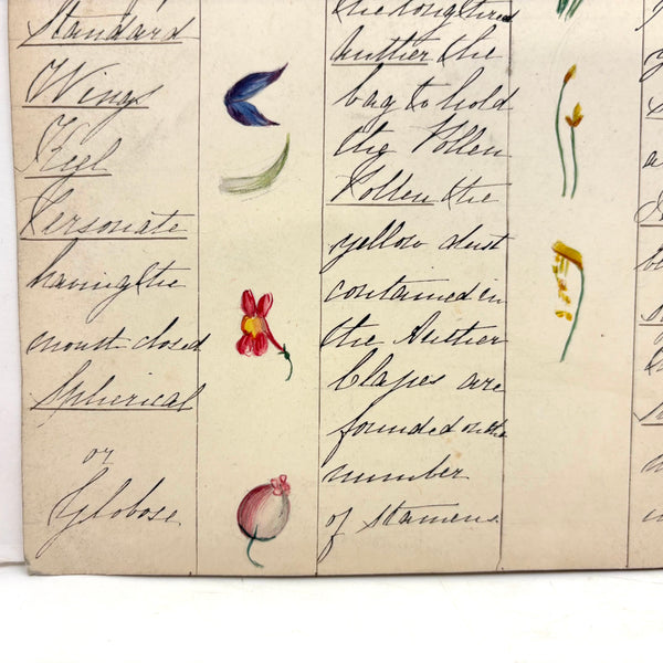 This is one of a series of beautiful antique ink and watercolor charts listed today, all executed long ago by a Bessie Slater (I believe, signed on the back of one of them), for a botany class, I presume. Each one homes in on a different aspect or aspects--this one is all about pollination/reproduction, detailing corolla, stamens, pistils, seed vessels, and seeds, with 26 examples described and carefully illustrated in watercolor. More than ever these days, when delight in the natural world offers primary solace from the madness of humans, this and these remind one of micro and macro orders, and growth and resilience, and also make me want to closely study every plant I pass! Delicate and special feeling, and hopeful feeling, too; better in hand, very lovely.