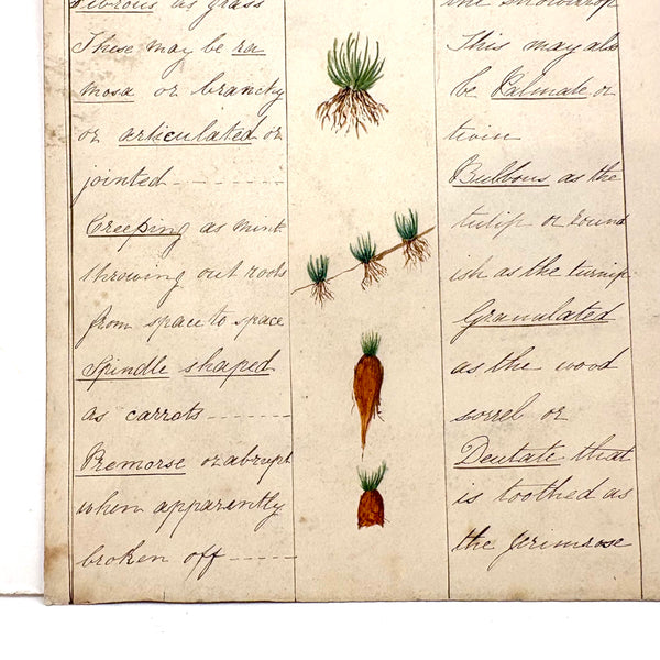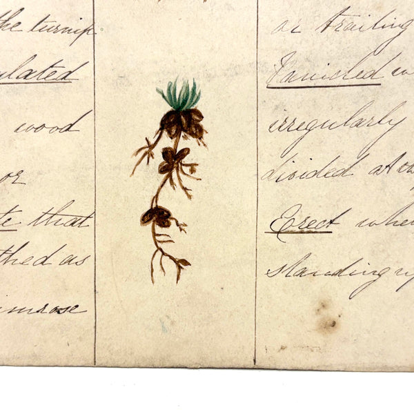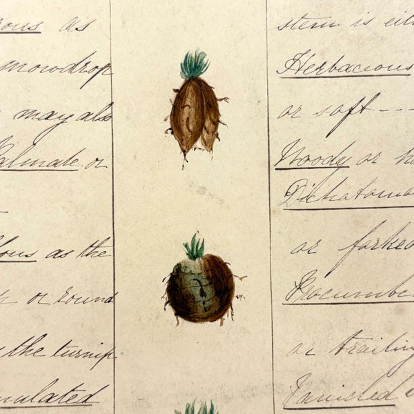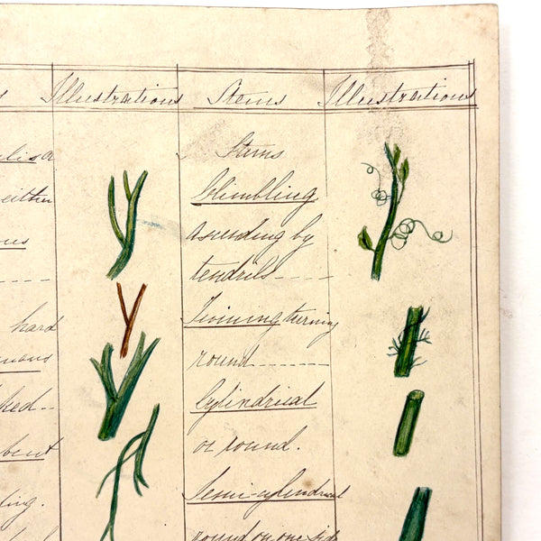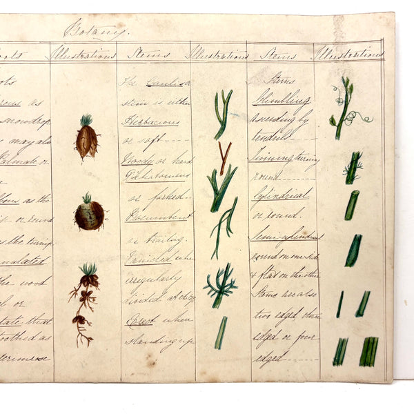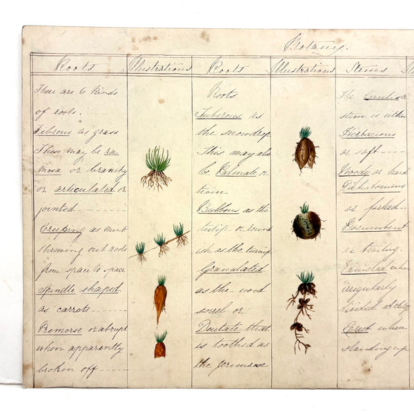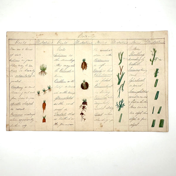 This is one of a series of beautiful antique ink and watercolor charts listed today, all executed long ago by a Bessie Slater (I believe, signed on the back of one of them), for a botany class, I presume. Each one homes in on a different aspect or aspects--this one roots and stems--with eight different root types (fibrous, creeping, spindle shaped) and twelve different stem types (herbaceous, woody, erect) described and carefully illustrated in watercolor. More than ever these days, when delight in the natural world offers primary solace from the madness of humans, this and these remind one of micro and macro orders, and growth and resilience, also make me want to closely study every plant I pass--though better to resist pulling them all up to study the roots! Delicate and special feeling, better in hand, very lovely.