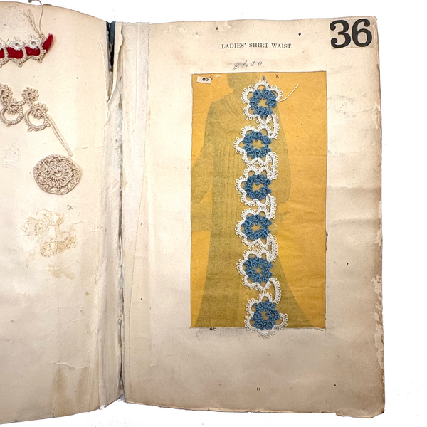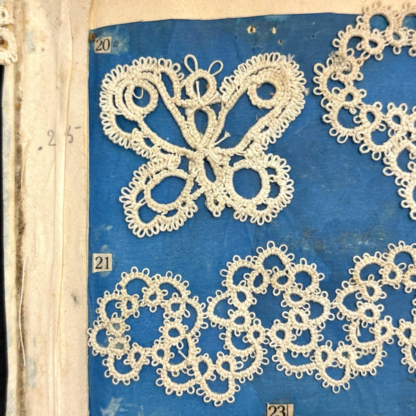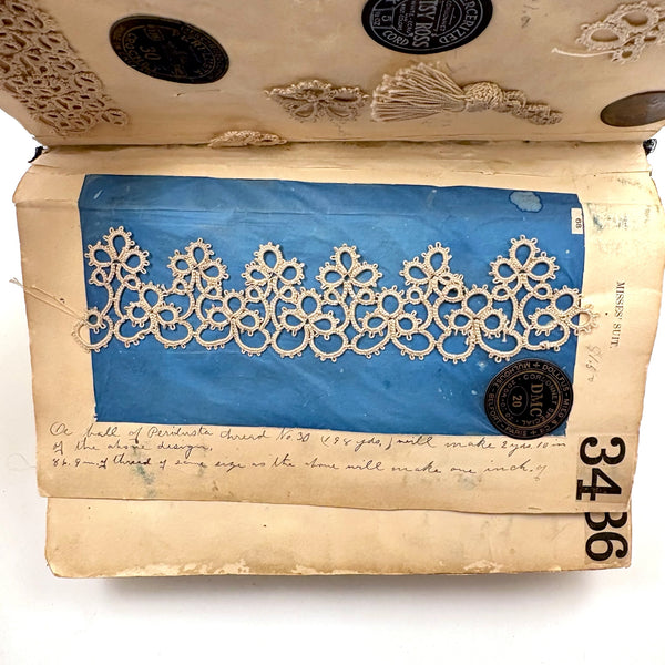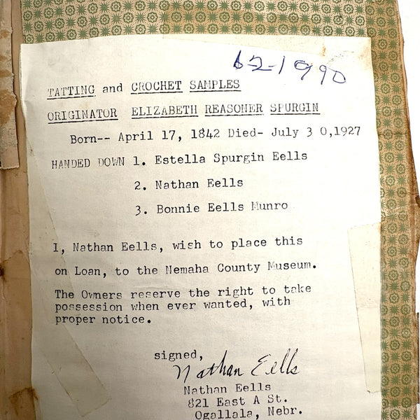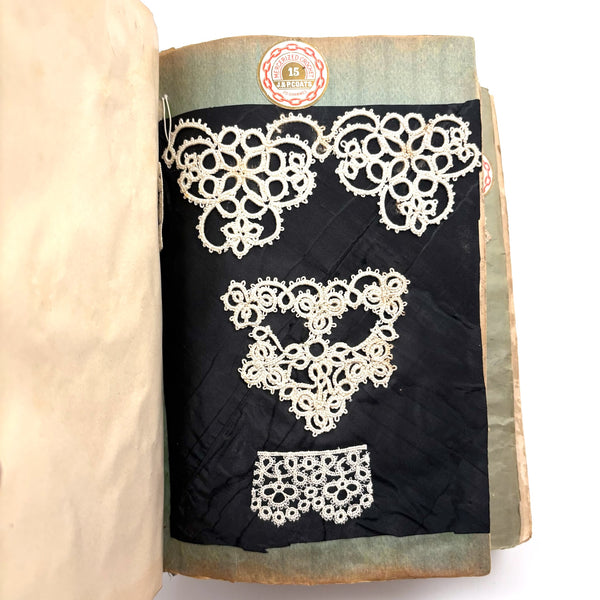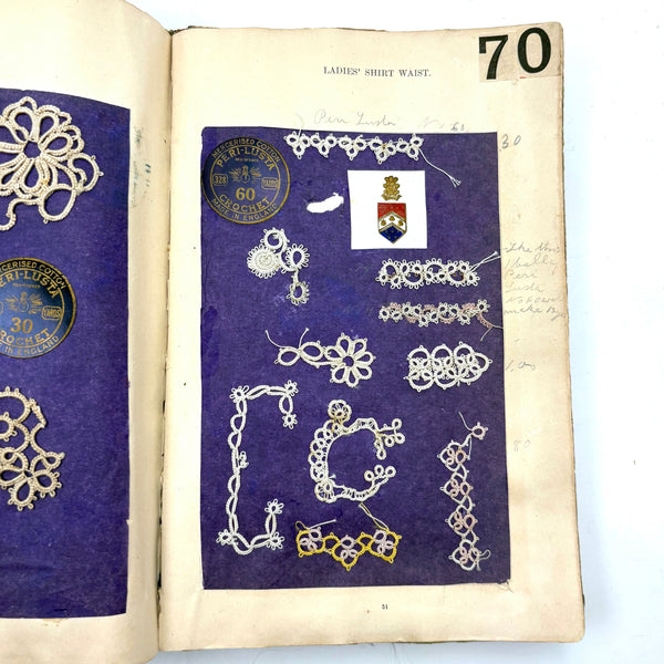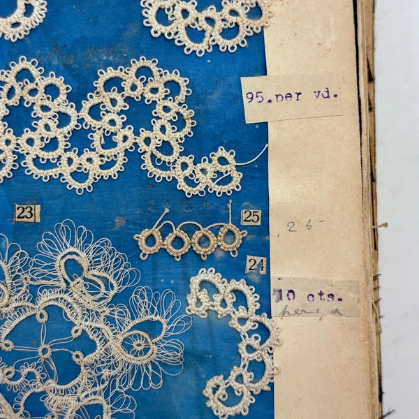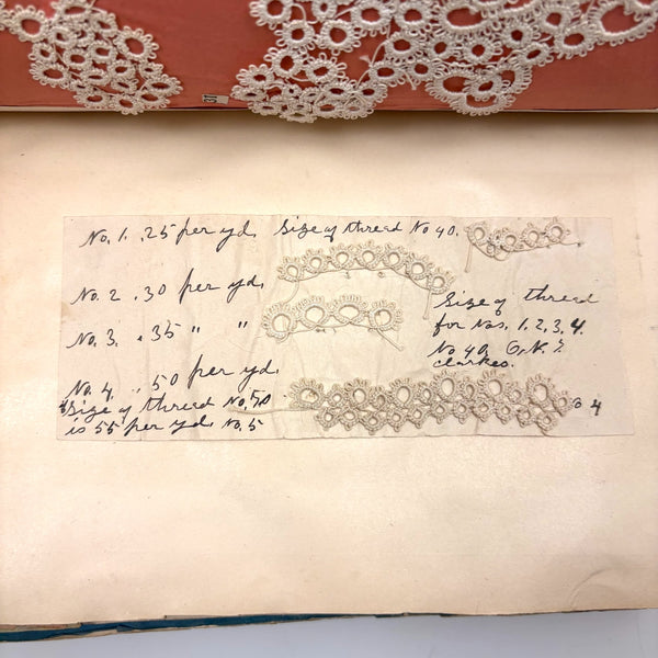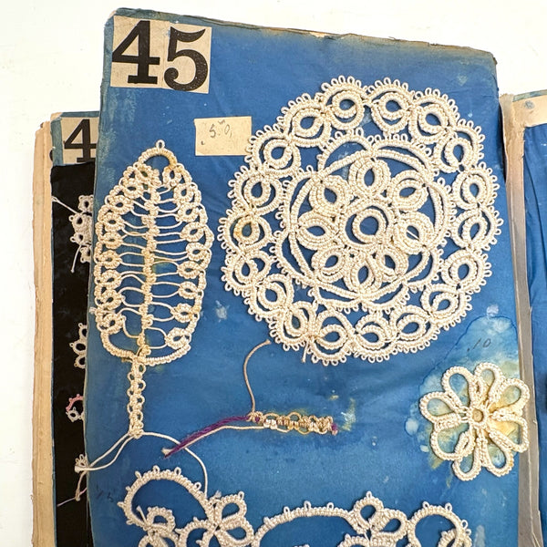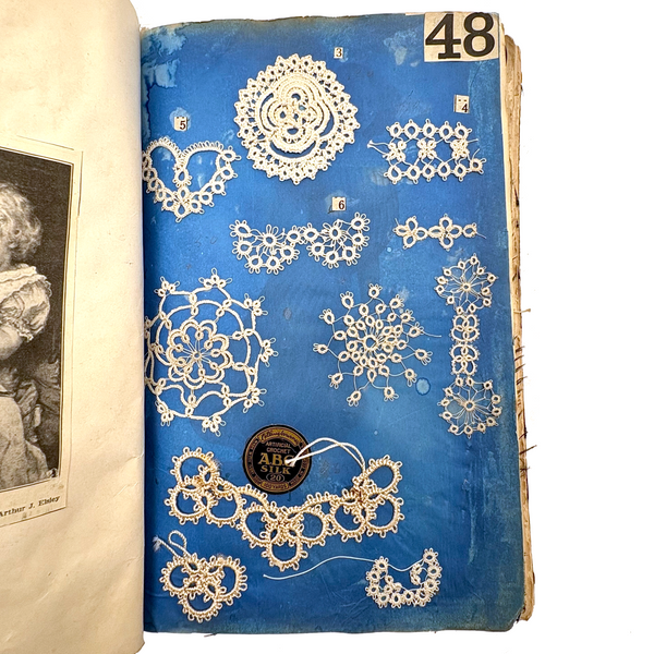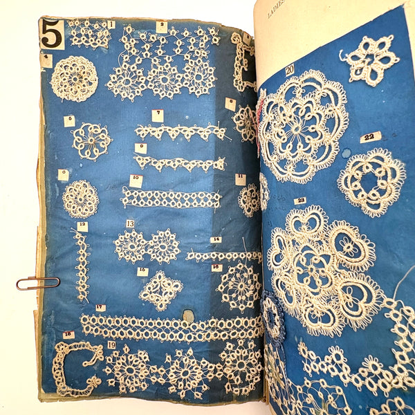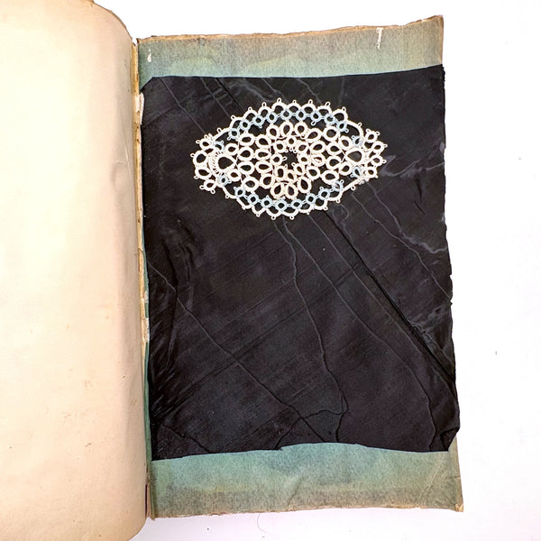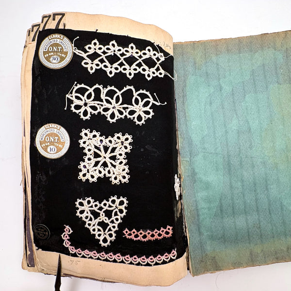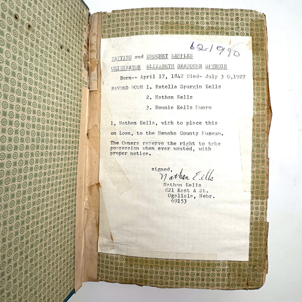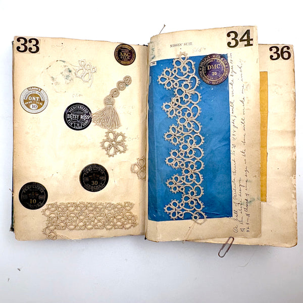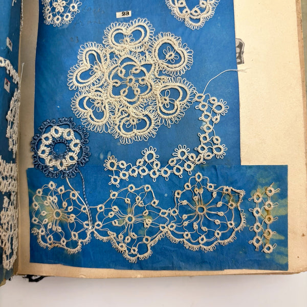 A true treasure, this one--a trove of many many treasures, really, and the manifestation of a lifetime's accumulation of lacemaking knowledge by a Ms. Elizabeth Reasoner Spurgin (1842-1927), who handed the book down to her daughter, Estella Eeels, in 1914.  The first inside page of the book provides a full, typewritten provenance, right down to the album's loan to Nemaha County Museum in 1990 from Nathan Eells of Ogallala, Nebraska. Photos give a good sense--though the thickness and density of the book makes it hard to photograph some of the early pages, which are also some of the best! In addition to producing many many many very fine pieces of "tatting", and crochet too, Elizabeth took great care to lay down colorful paper (often in cyanotype blue) before arranging and mounting the samples, and pasted down printed page numbers to the corners of the pages too. And she was diligent in including stickers from the spools of the thread used, as well as often recording the cost of thread required for making a given piece of lace. I believe the album was actually created by joining two books together, with is a page occasionally left uncovered with samples, showing a very Victorian "Little boy's suit" or "little girl's coat" here and there. This is really a marvelous thing.