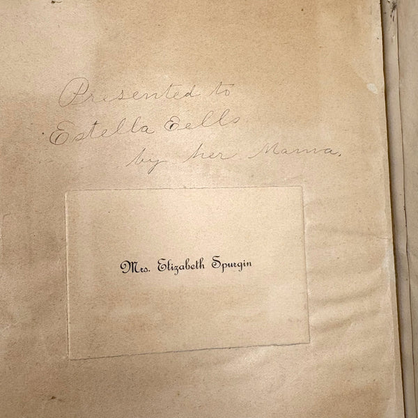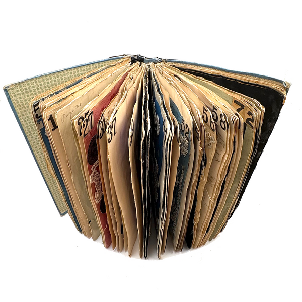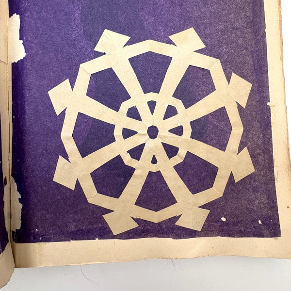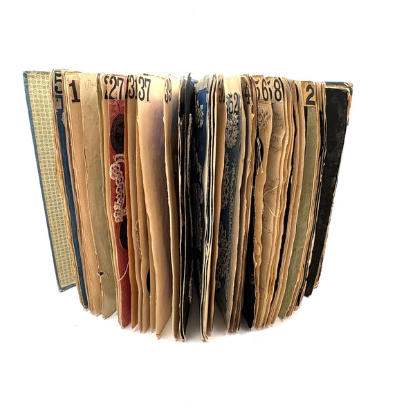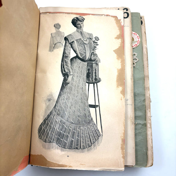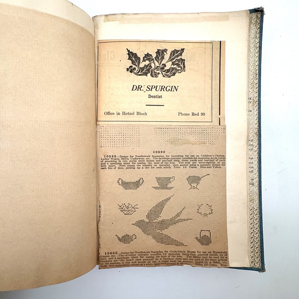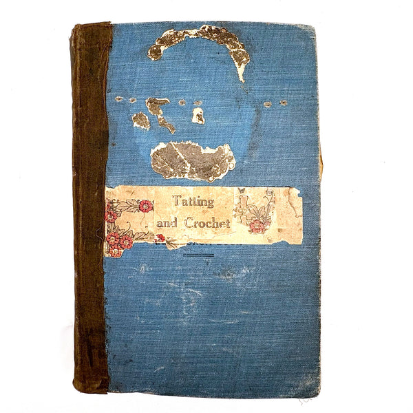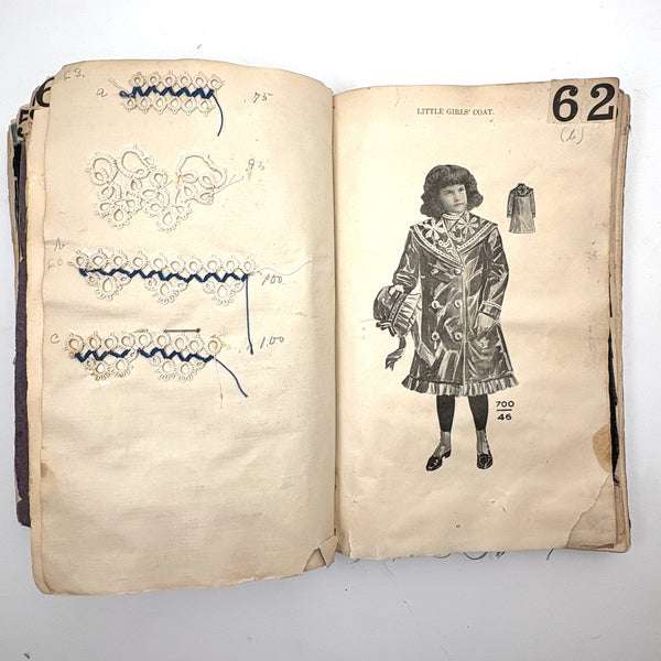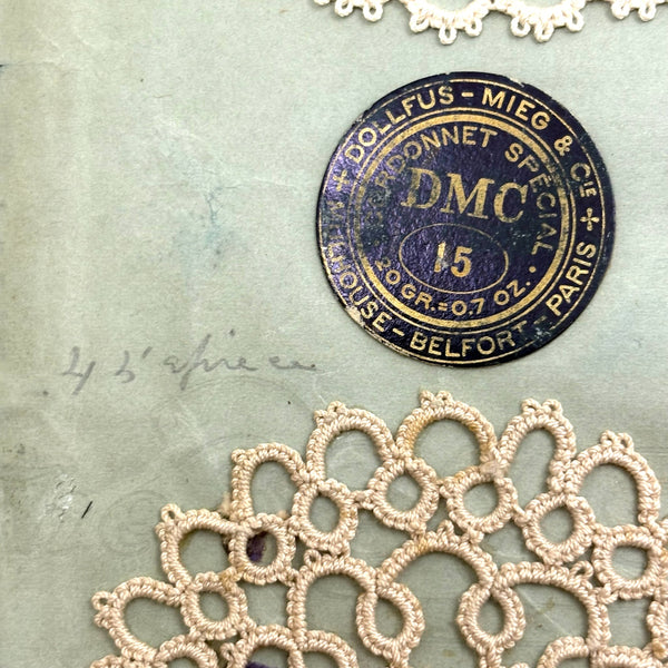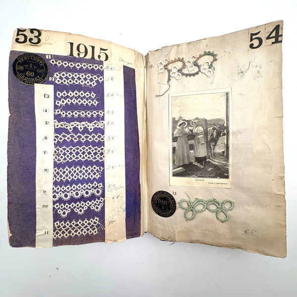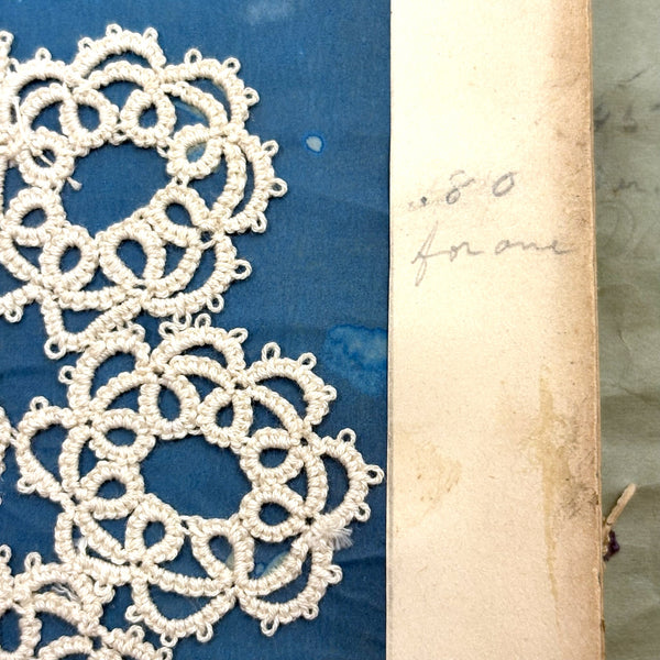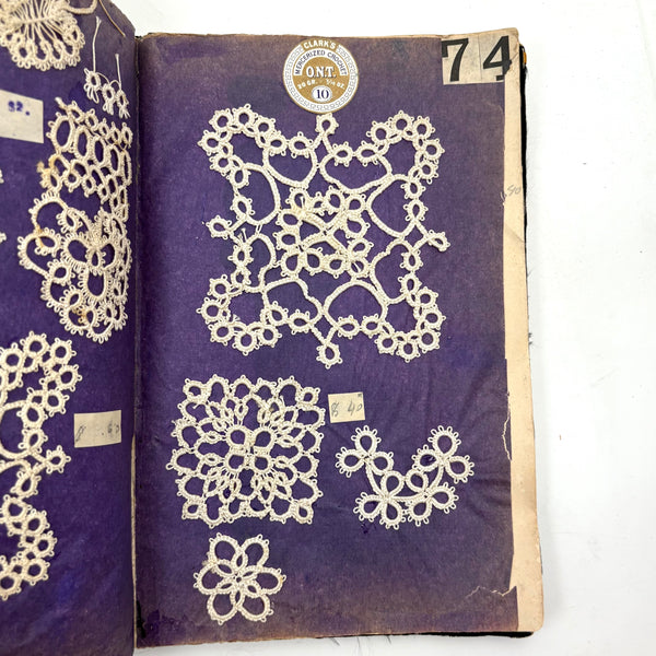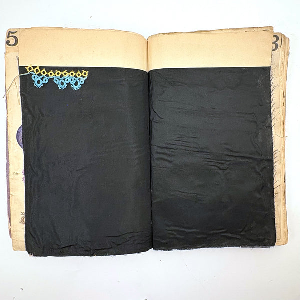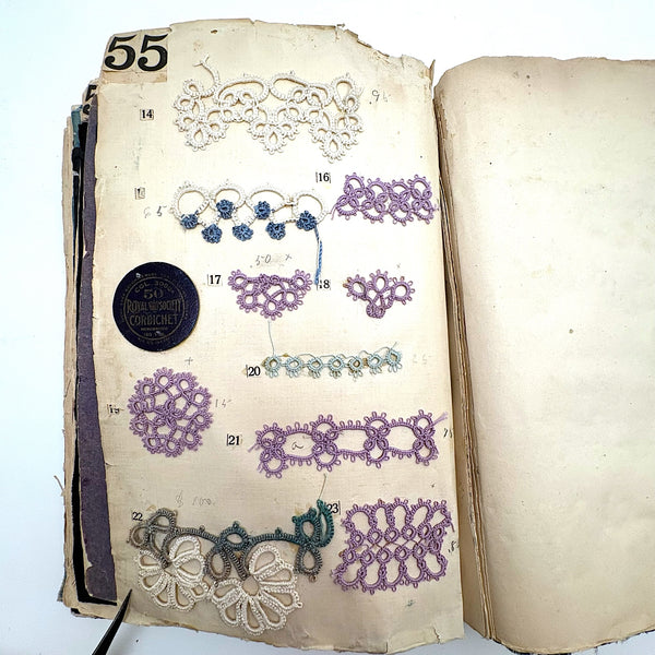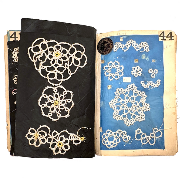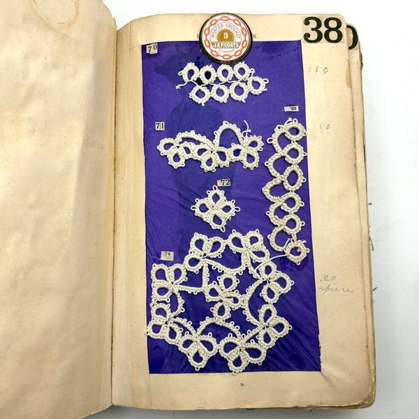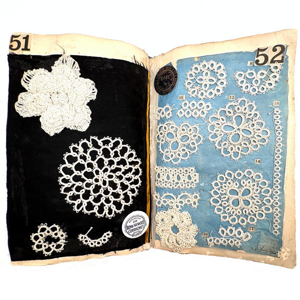 A true treasure, this one--a trove of many many treasures, really, and the manifestation of a lifetime's accumulation of lacemaking knowledge by a Ms. Elizabeth Reasoner Spurgin (1842-1927), who handed the book down to her daughter, Estella Eeels, in 1914.  The first inside page of the book provides a full, typewritten provenance, right down to the album's loan to Nemaha County Museum in 1990 from Nathan Eells of Ogallala, Nebraska. Photos give a good sense--though the thickness and density of the book makes it hard to photograph some of the early pages, which are also some of the best! In addition to producing many many many very fine pieces of "tatting", and crochet too, Elizabeth took great care to lay down colorful paper (often in cyanotype blue) before arranging and mounting the samples, and pasted down printed page numbers to the corners of the pages too. And she was diligent in including stickers from the spools of the thread used, as well as often recording the cost of thread required for making a given piece of lace. I believe the album was actually created by joining two books together, with is a page occasionally left uncovered with samples, showing a very Victorian "Little boy's suit" or "little girl's coat" here and there. This is really a marvelous thing.