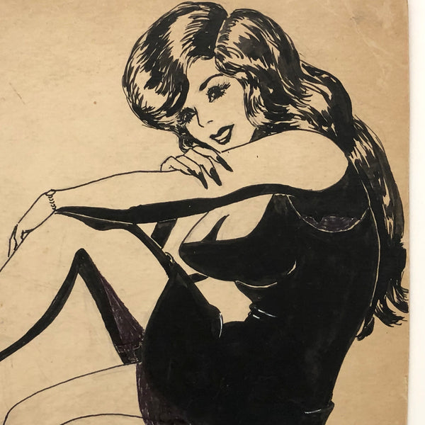 A couple of years ago I bought a small stack of drawings that I soon later learned were the work of Bill Anthony, a mid 20th century artist/illustrator from Virginia, examples of whose work (somewhat more risque than this one, and also more absurd!) were presented in Josh Lowenfels booth at the 2019 Outsider Art Fair. (Blurb from artsy.net below.) I sold a number of them then and sat on the rest, but on this week when I didn't get out hunting, I pulled them back out and decided to list this and two others. Women in short skirts and very high heels were clearly his fixation, but the equal attention paid to faces and outfits and gestures and hairstyles I think makes them more interesting- perhaps partially a means of veiling or offsetting the former, but more so it seems to me central to the dynamic. I especially love the very long fingernails on this woman, and also the watch on her other arm, as if grounding her--or him!--in the moment.