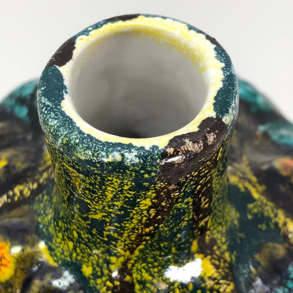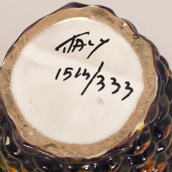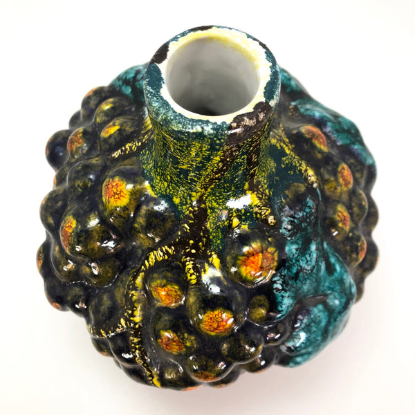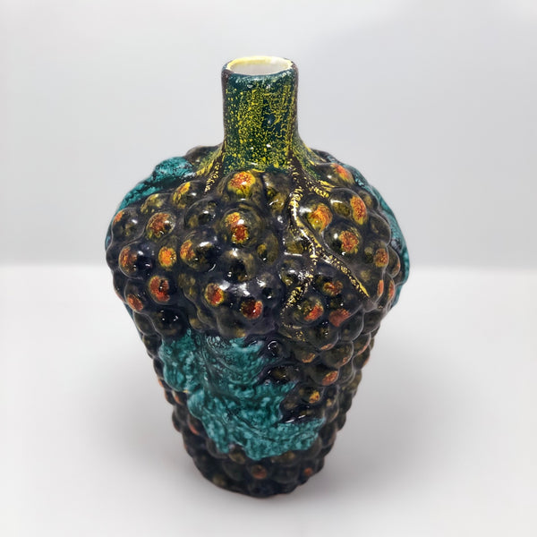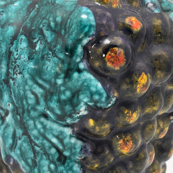 I believe this unusual mid-century Bitossi ceramic vessel once had a stopper and was made to function as a decanter--and a fabulous one I think it would make! One could easily stick a cork or any old stopper in it to use that way, or stick a flower in it and put it at the center of a festive dinner party table--perfect right next to a good bottle of Chianti! Really fun, with great sculptural form mimicking a bunch of grapes and terrific drippy glazing.