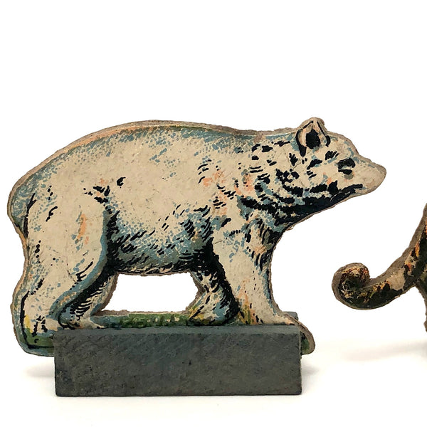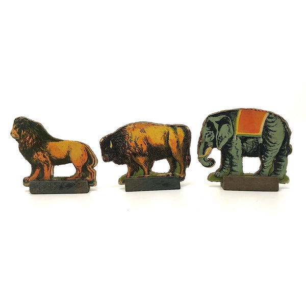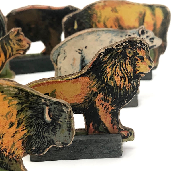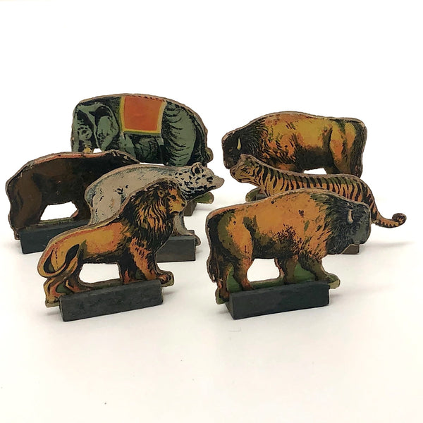 I'm pretty certain this gang of seven was once part of a larger animal fleet produced by R. Bliss Manufacturing Company (Pawtucket, Rhode Island, 1832-1935), which came along with a wonderful Noah's Arc. Very late 19th or early 20th century, I believe, they're still in very good shape, litho on die-cut cardboard (printed on both sides) and mounted on wooden bases. I think I'd just march them along the front of a shelf to make myself happy!