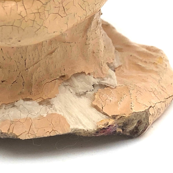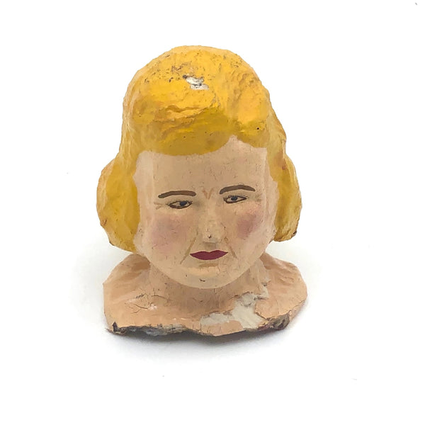 3/4 x 2 15/16 x 2 7/8 d and in overall pretty good shape, with one small ding to the top of her head and some roughness and paint loss along the edge bottom, as evident and documented.